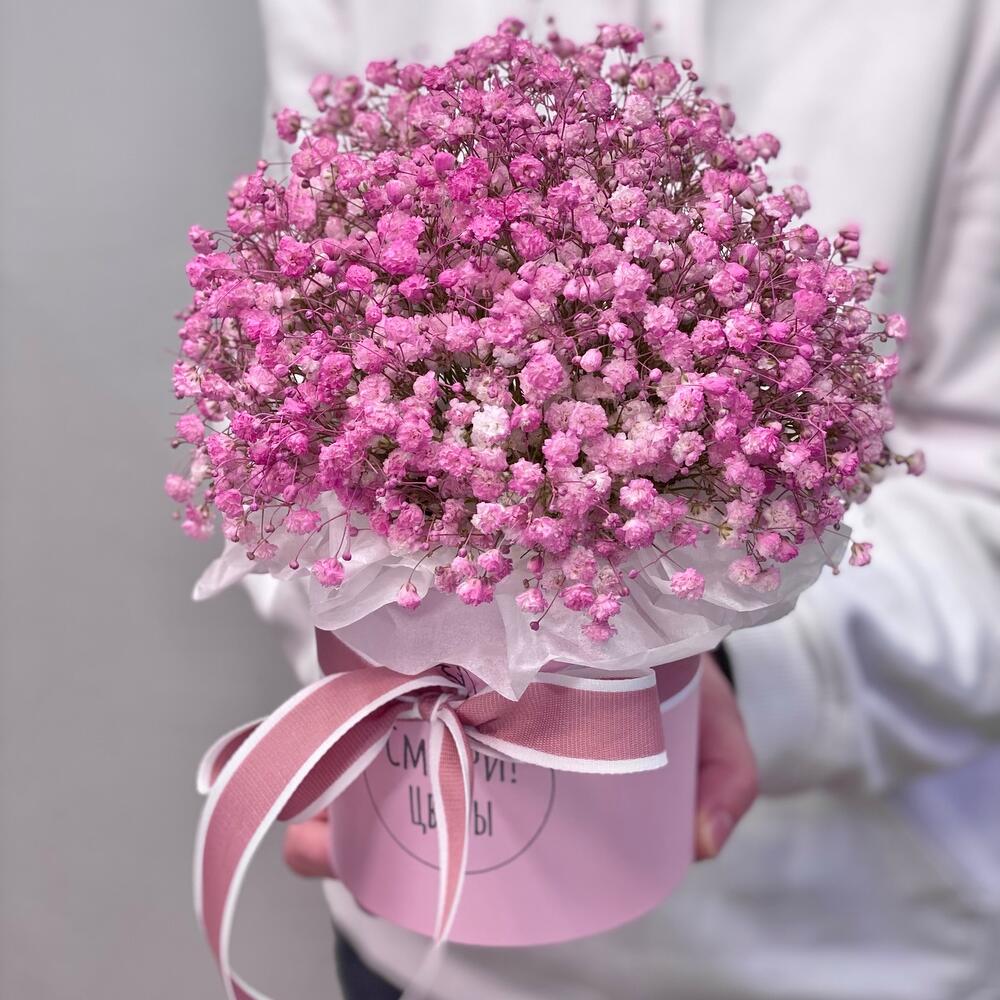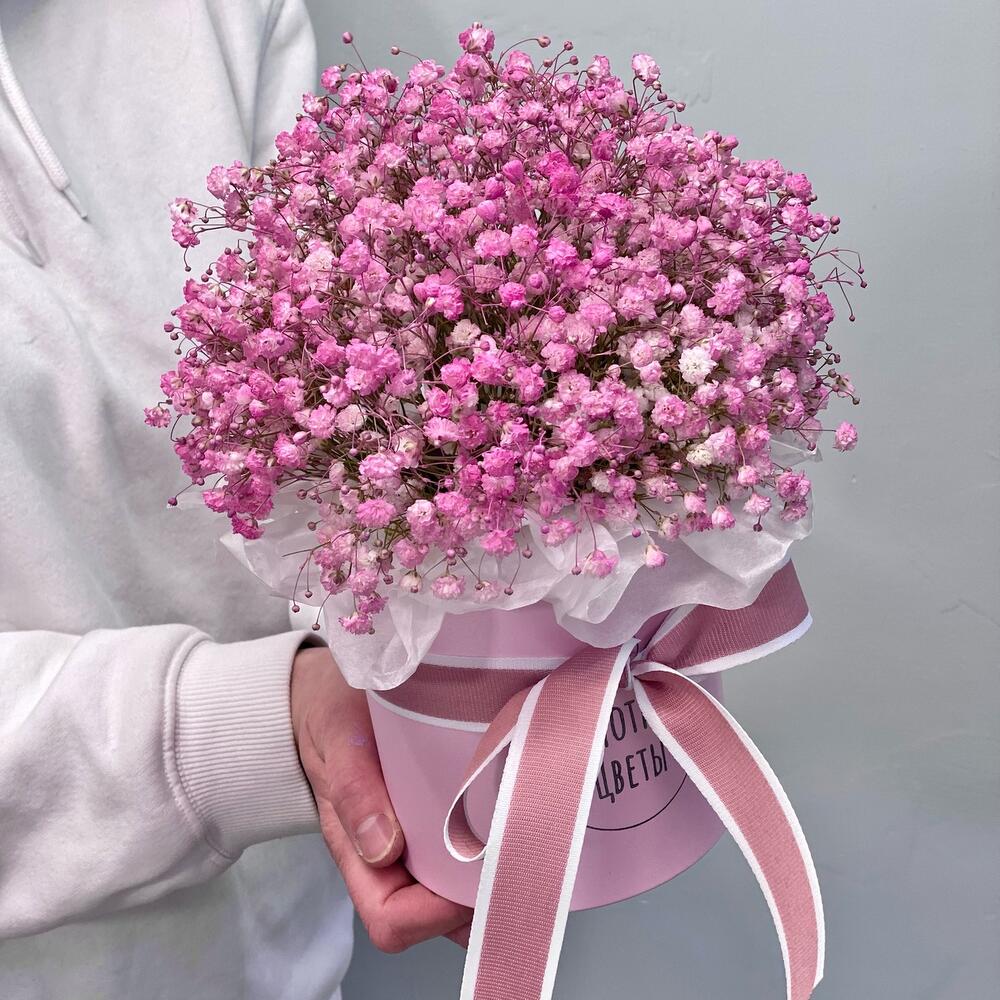 Прекрасная коробочка из розовой гипосфилы ☺️🙌🏽Коробка из гипсофилы – это всегда универсальный подарок, который можно подарить практически по любому поводу. Будь то день рождения или свидание, либо если Вы просто хотите напомнить о себе ☺️А так же букет в шляпной коробке – это еще и удобно, ведь не нужно думать куда поставить цветы, достаточно просто периодически подливать воду на флористическую губку, в которой стоит композиция из цветов Гипсофила один из самых стойких цветов, которые впоследствии очень удобно становятся сухоцветом и совсем не теряют своего внешнего вида, благодаря чему веточки гипсофилы можно использовать дома в качестве предмета интерьера 🏠