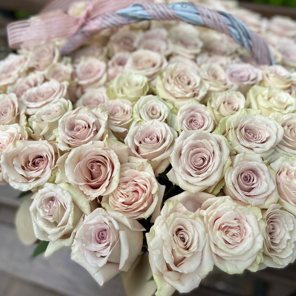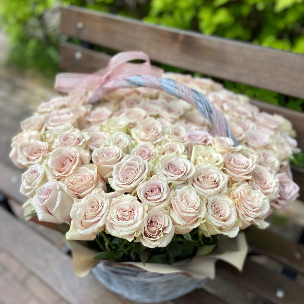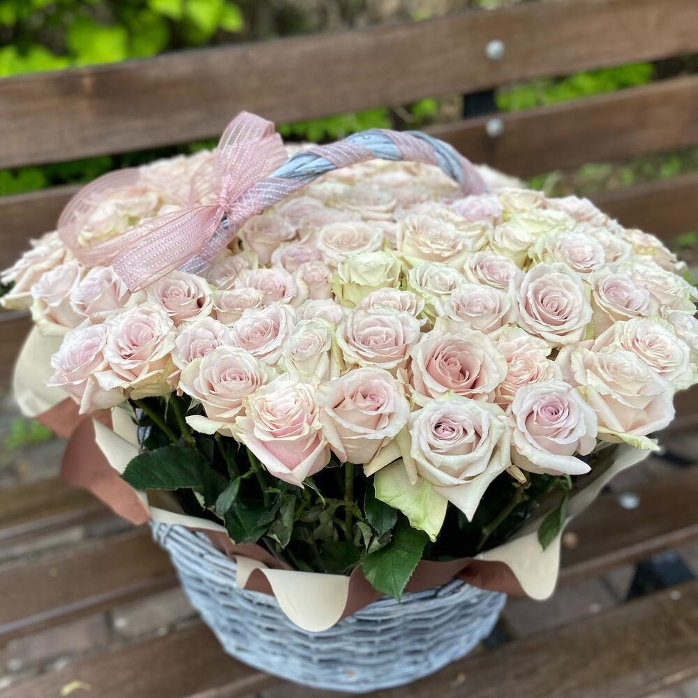 Лента атласная – 1 шт. Корзина плетеная – 1 шт. Оазис флористический – 3 шт. Эквадор роза – 101 шт.