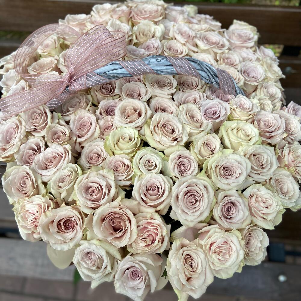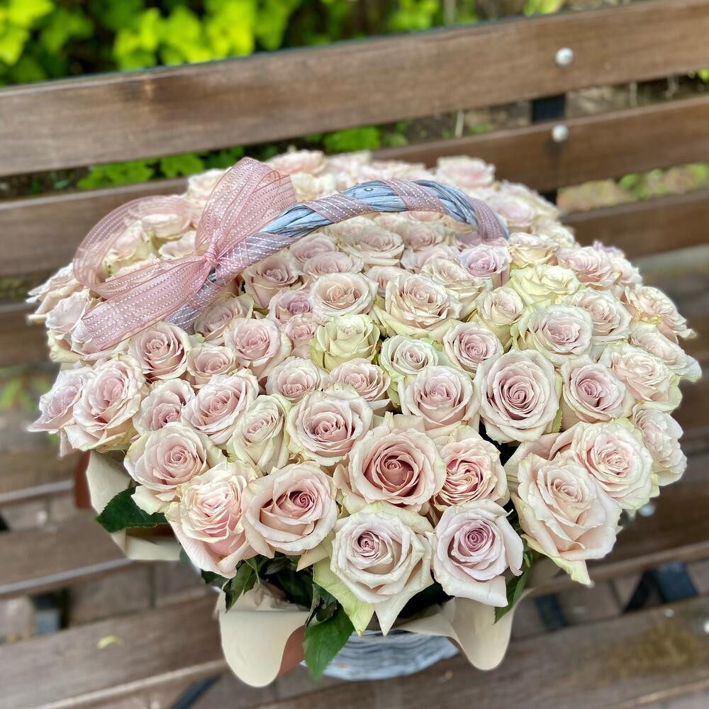 Лента атласная - 1 шт. Корзина плетеная - 1 шт. Оазис флористический - 3 шт. Эквадор роза - 101 шт.