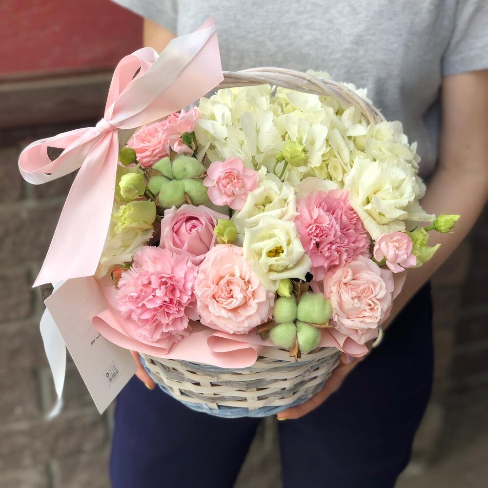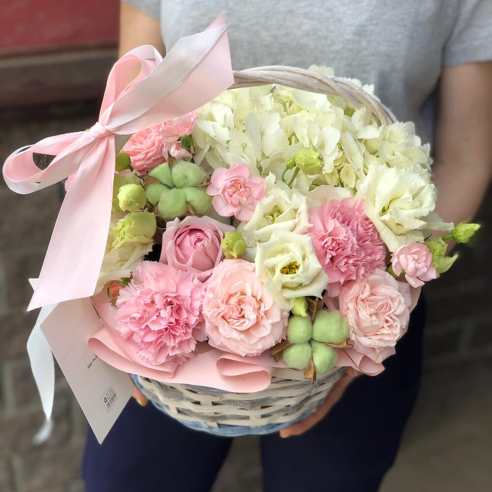 Гортензия - 1 шт. Корзина - 1 шт. Хлопок - 2 шт. Кустовая роза - 3 шт. Эустома - 2 шт. Диантус - 7 шт.