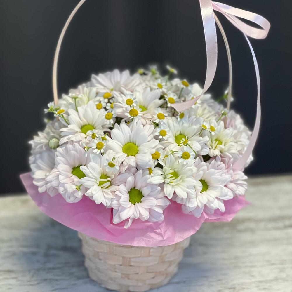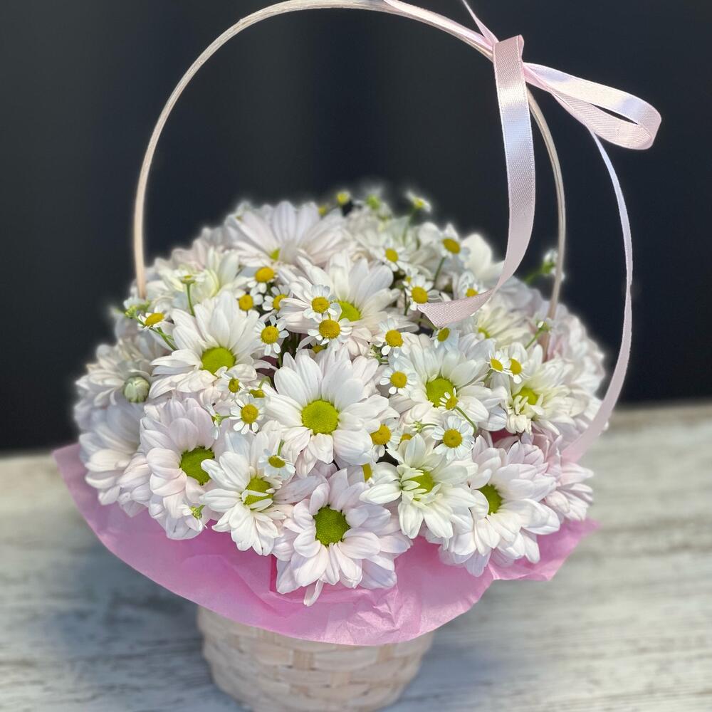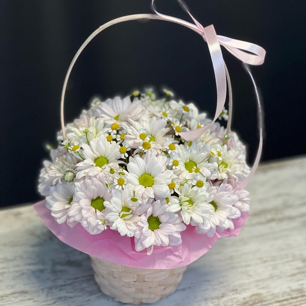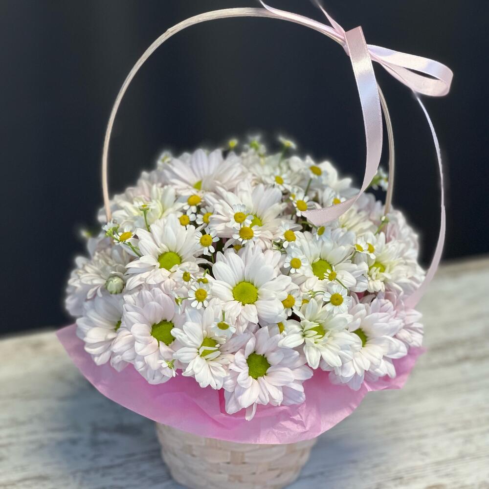 Танацетум - 2 шт. Хризантема кустовая - 3 шт. Атласная лента - 1 шт. Корзина плетеная - 1 шт. Оазис флористический - 1 шт. Бумага тишью - 1 шт.