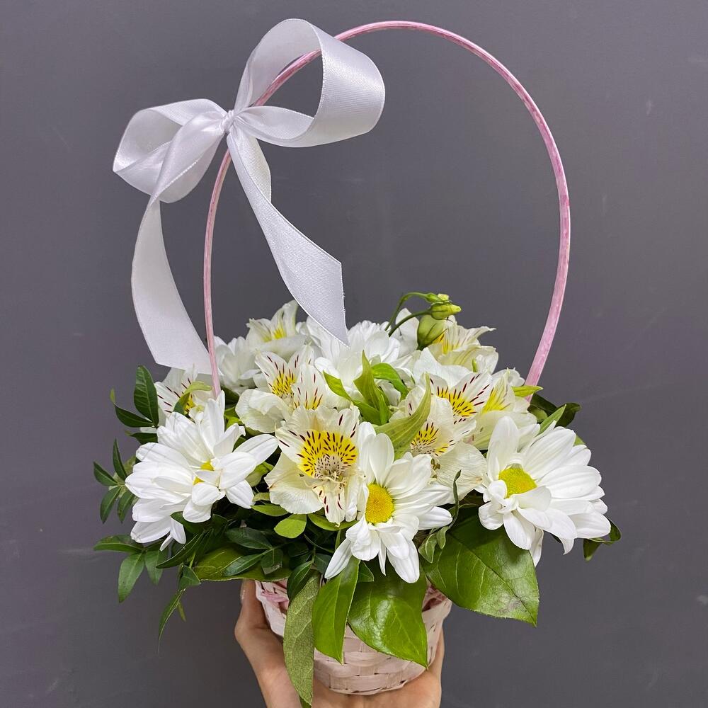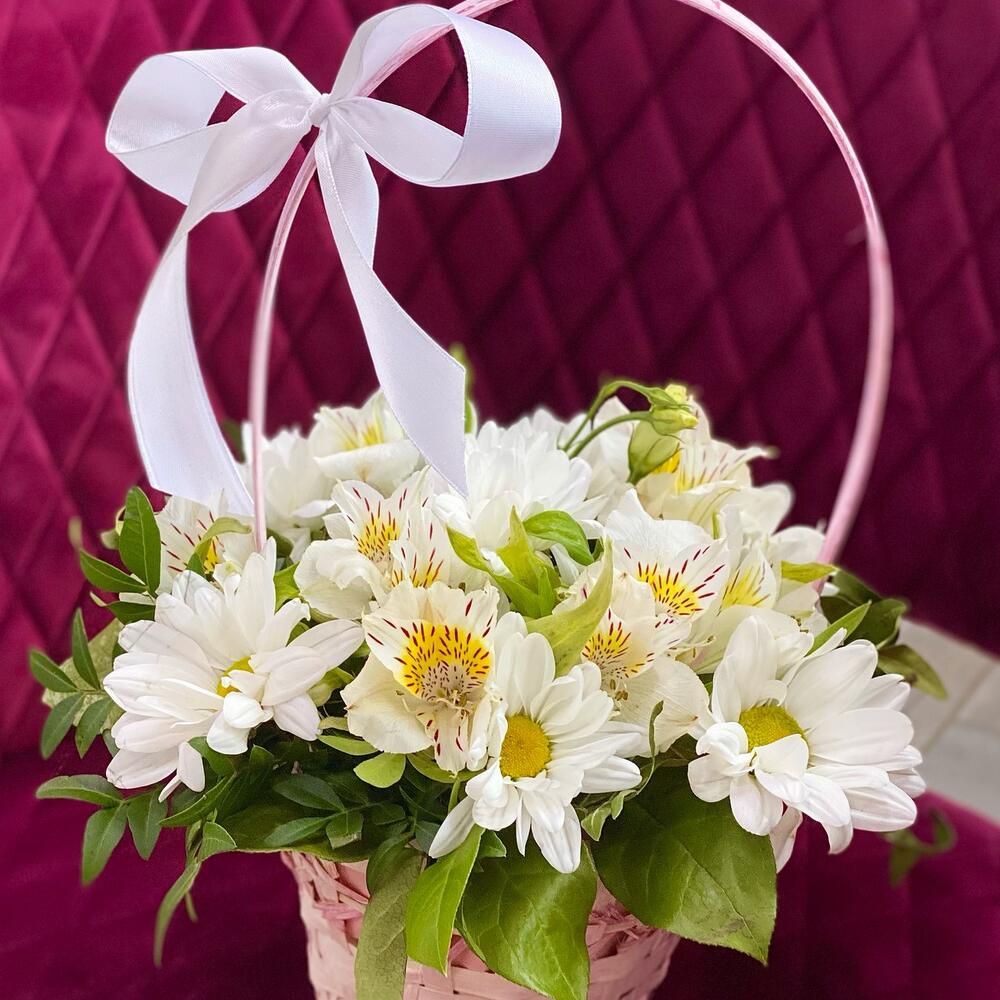 Композиция в корзиночке из белых цветов порадует своего получателя. Особой стойкостью отличаются хризантемы и альстромерии, входящие в состав нашей композиции! Милая аккуратная белоснежная композиция подойдёт для подарка ребёнку, девушке, маме. Современно и удобно – обойтись без поиска вазы!