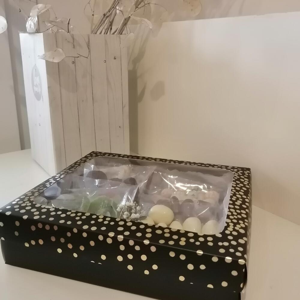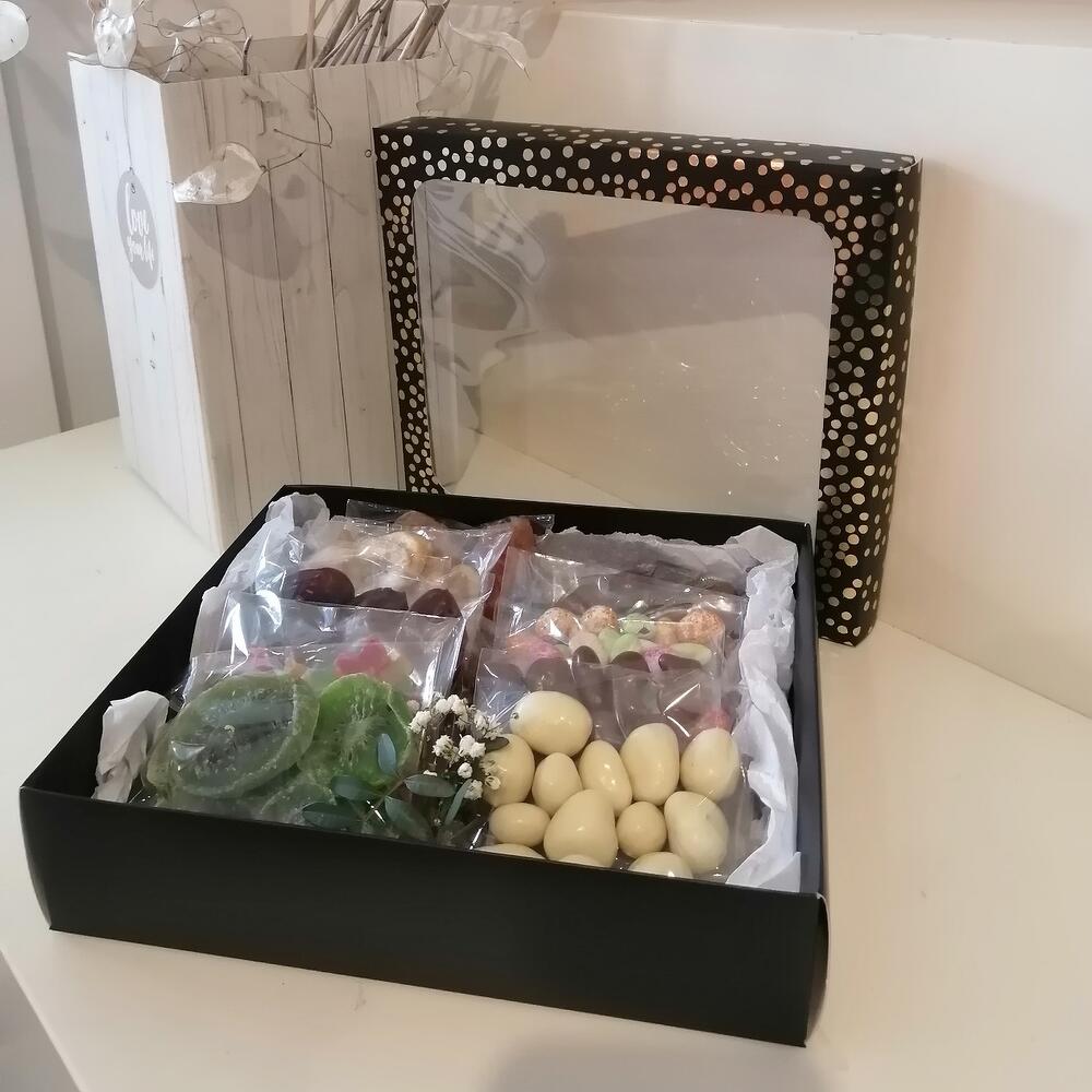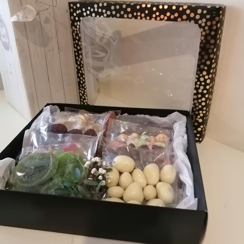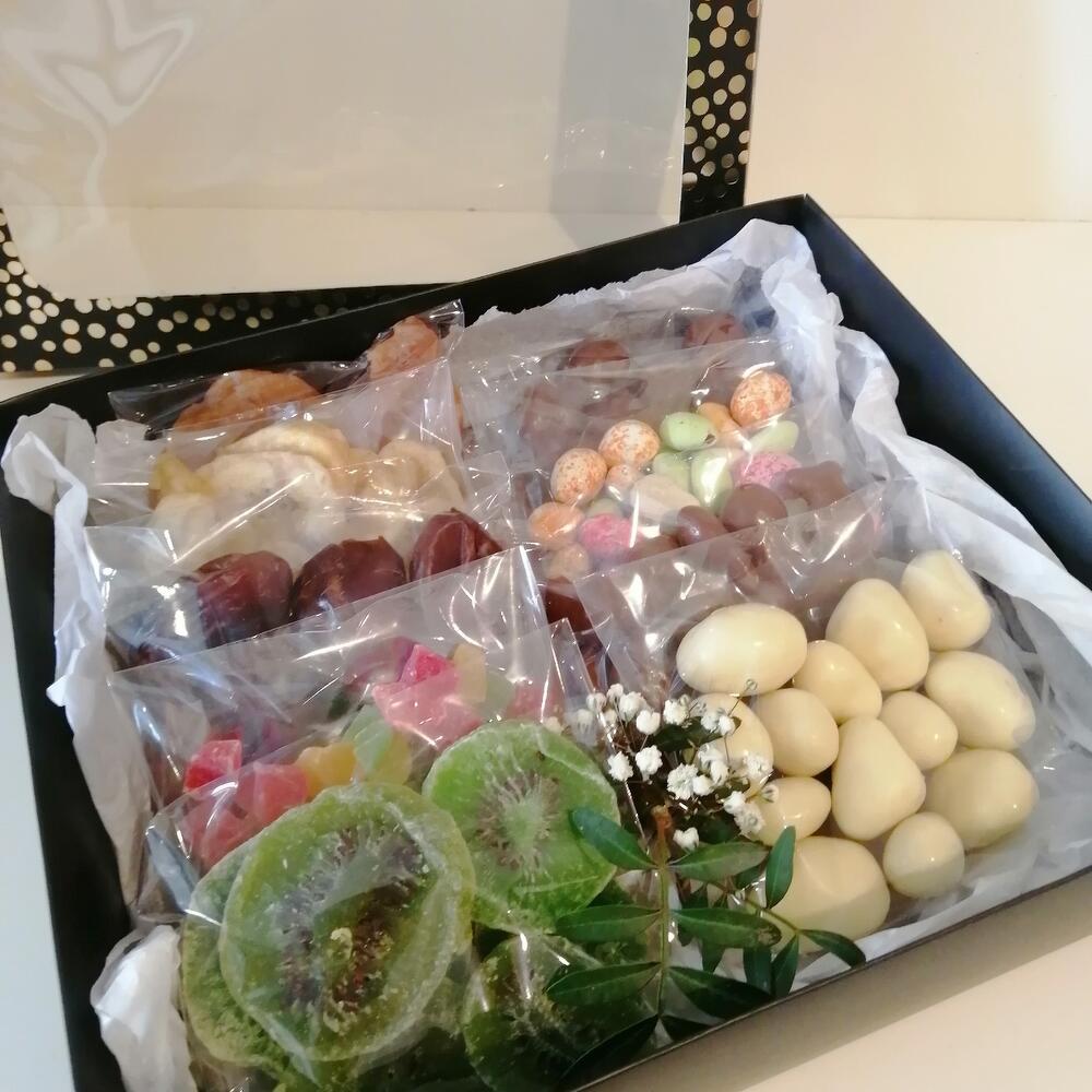 Киви – 50 гр. Подарочная коробка – 1 шт. Клубника в шоколаде – 60 гр. Вафли в шоколаде – 60 гр. Финики – 50 гр. арахис в глазури – 60 гр. банан сушеный – 50 гр. папайя сушеная – 50 гр. грецкий орех в шоколаде – 60 гр. груша вяленая – 50 гр.