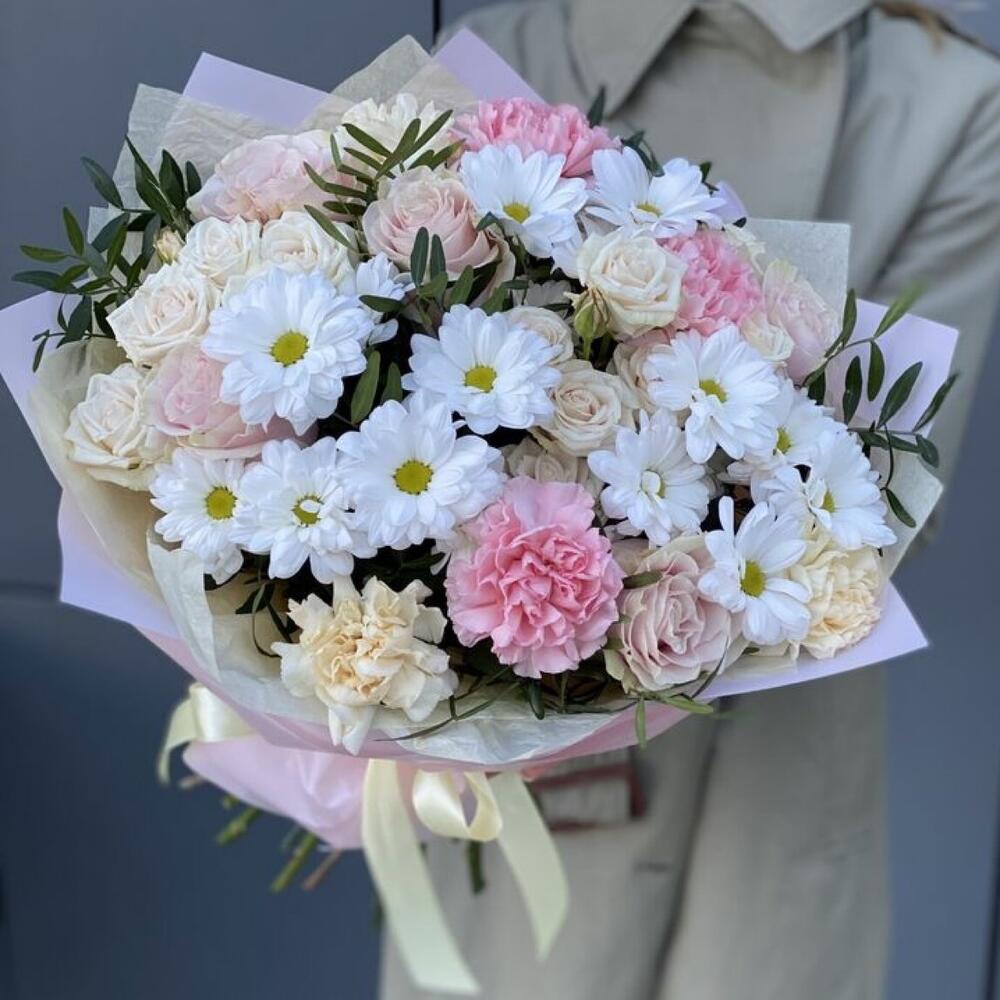 Хризантема кустовая – 3 шт. Диантус – 7 шт. Фисташка – 3 шт. Оформление – 1 шт. Кустовая роза пионовидная – 3 шт. роза фруттето – 5 шт.
