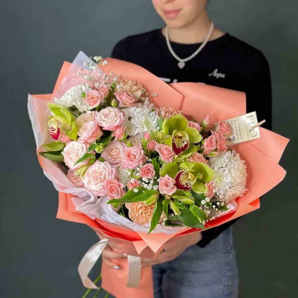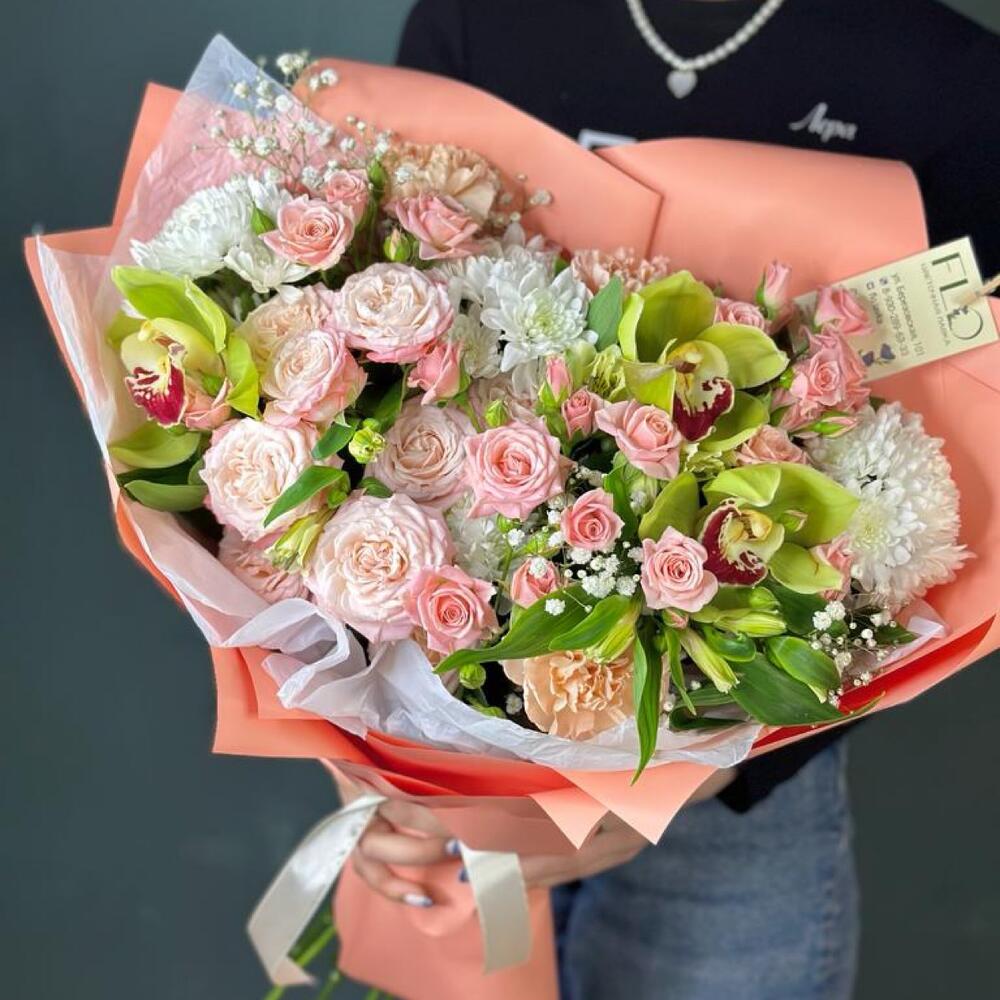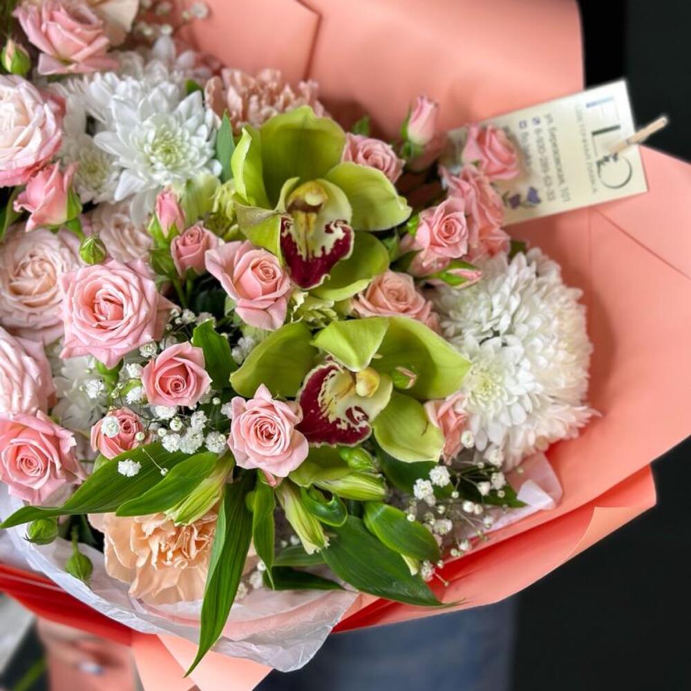 Гипсофила - 2 шт. Орхидея Цимбидиум - 3 шт. Хризантема кустовая - 3 шт. Зелень - 3 шт. Лента атласная - 1 шт. Диантус - 3 шт. Упаковка дизайнерская - 1 шт. Кустовая роза Лидия - 6 шт.