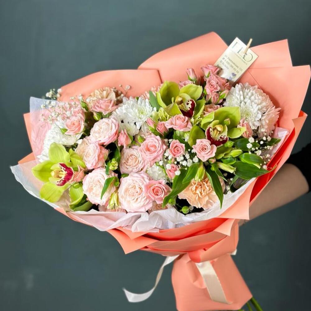 Гипсофила – 2 шт. Орхидея Цимбидиум – 3 шт. Хризантема кустовая – 3 шт. Зелень – 3 шт. Лента атласная – 1 шт. Диантус – 3 шт. Упаковка дизайнерская – 1 шт. Кустовая роза Лидия – 6 шт.