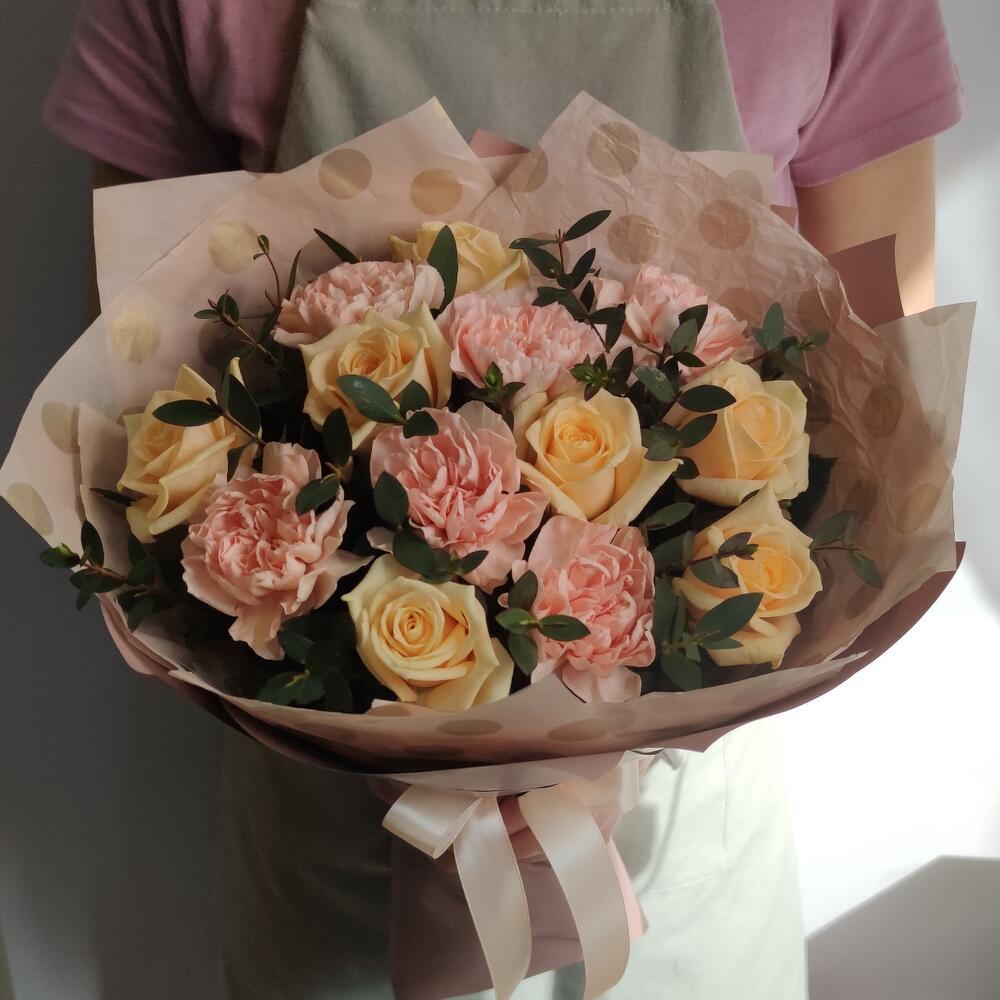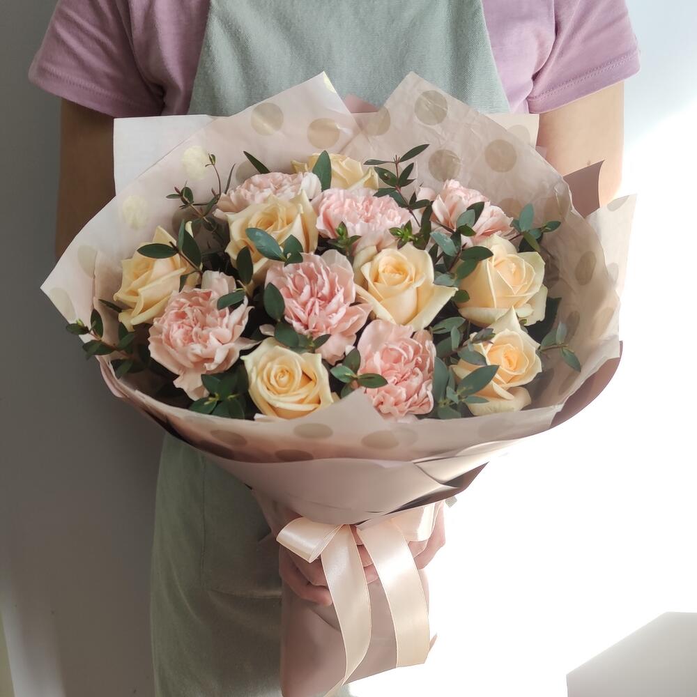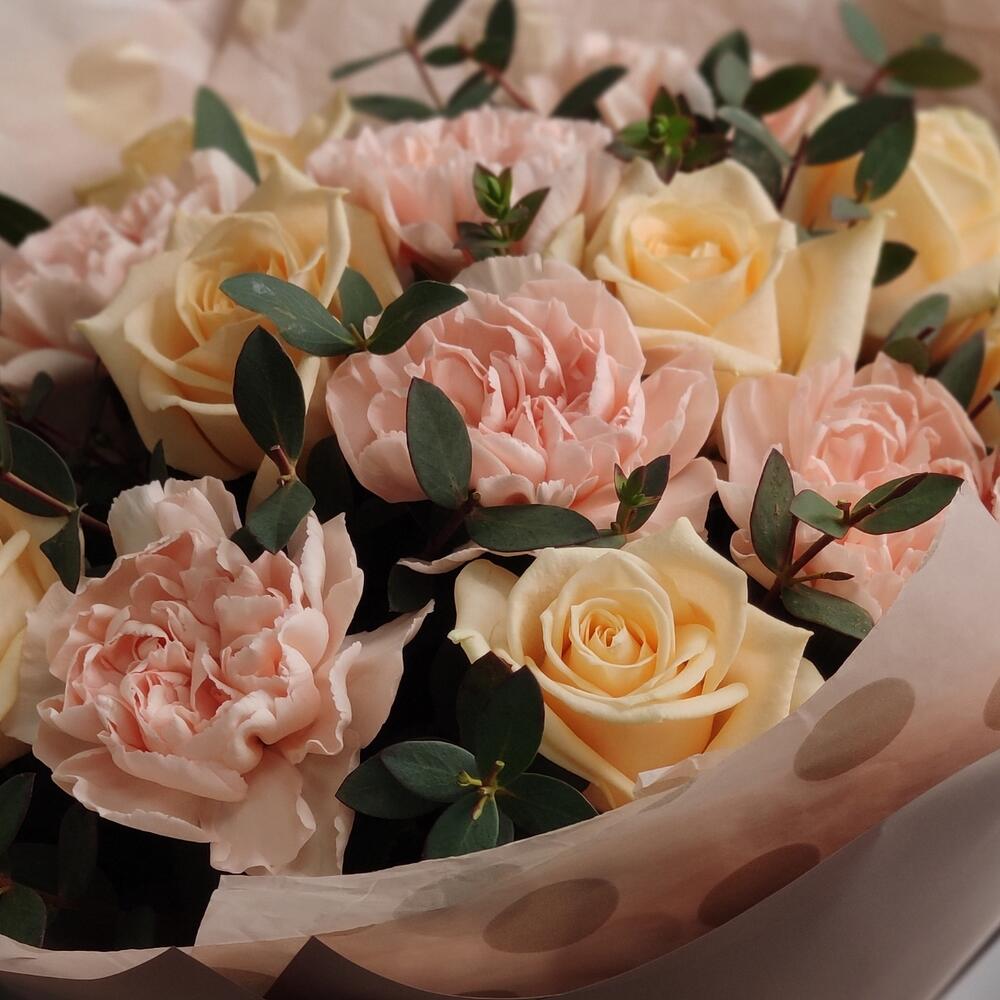 Роза кремовая - 7 шт. Гвоздика персиковая - 6 шт. Эвкалипт первифолиа - 3 шт. тишью горошек - 1 шт. пленка кремовая матовая - 1 шт.