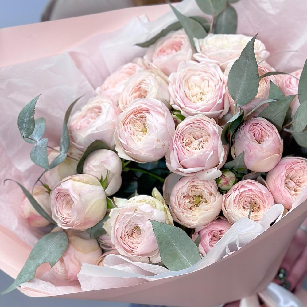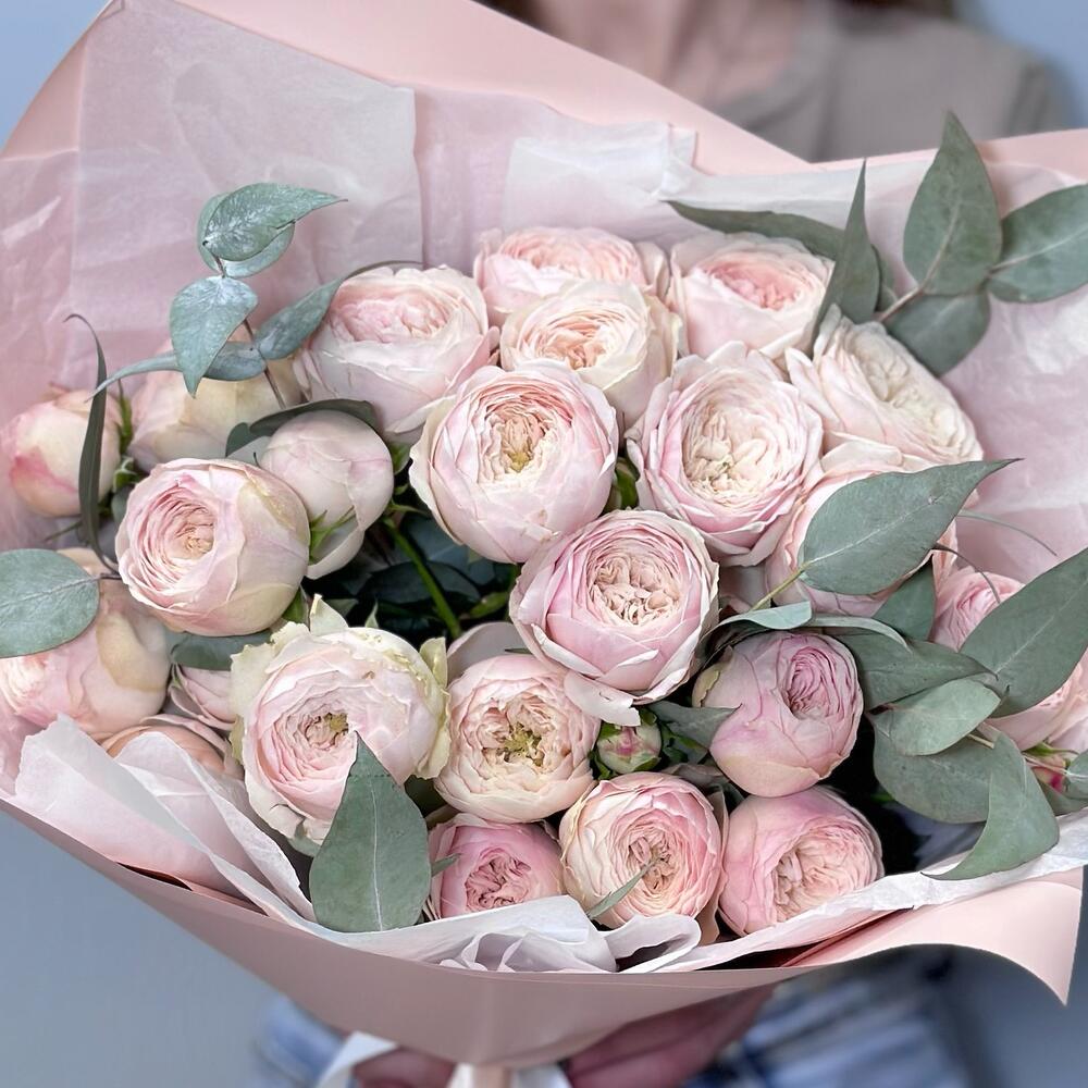 Нежный букет из пионовидных кустовых роз розового оттенка в персиковой упаковке с ароматным эвкалиптом Шикарная нежно-розовая кустовая роза с необычным раскрытием бутона будет радовать своего обладателя необычайной красотой Букет из пионовидных роз можно заказать на доставку в Нижнем Новгороде и подарить на день рождения, юбилей, подруге, маме, любимой жене, коллеге, на 8 марта, 14 февраля, День матери Фирменная открытка и подкормка для цветов в подарок