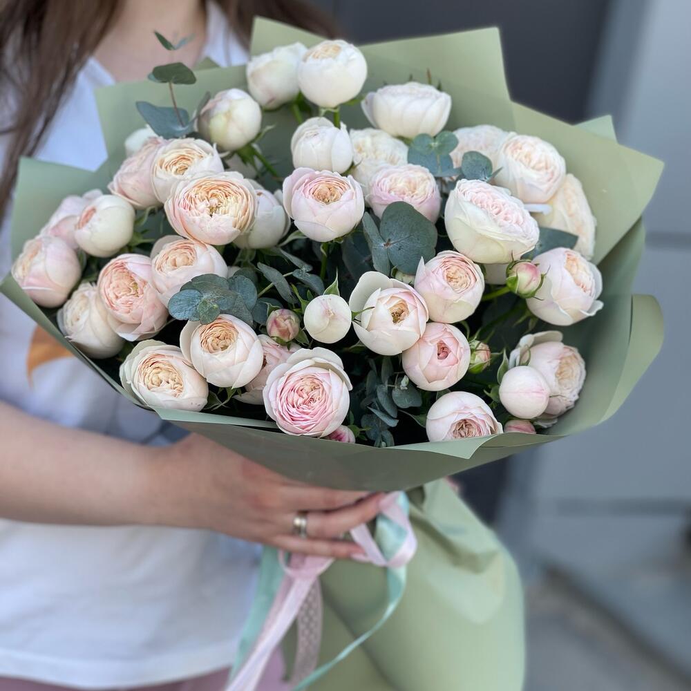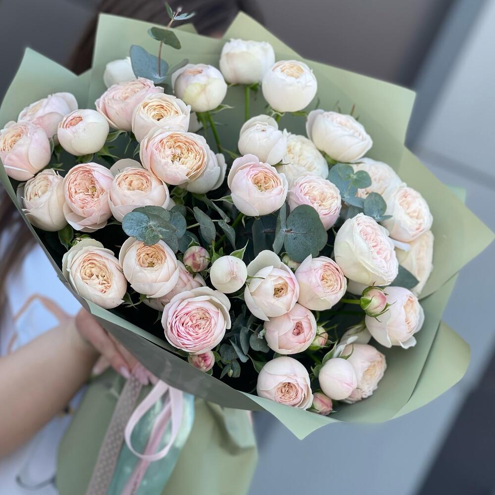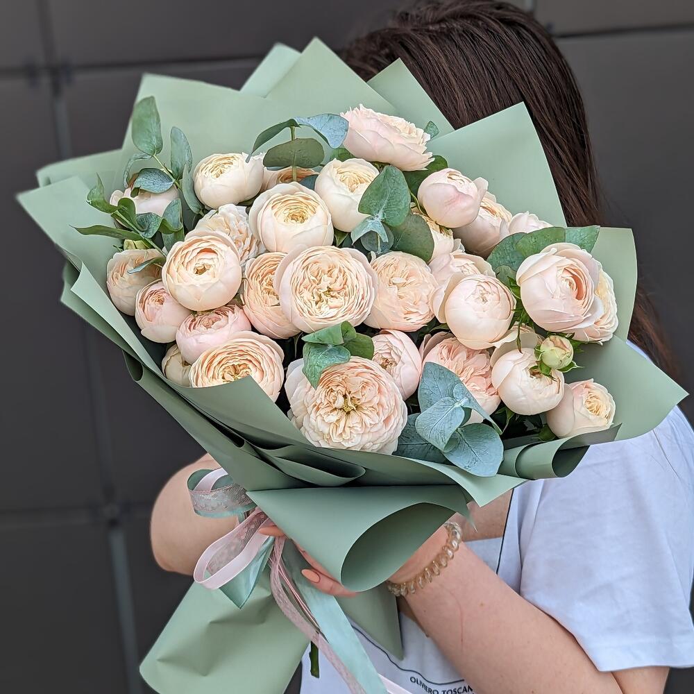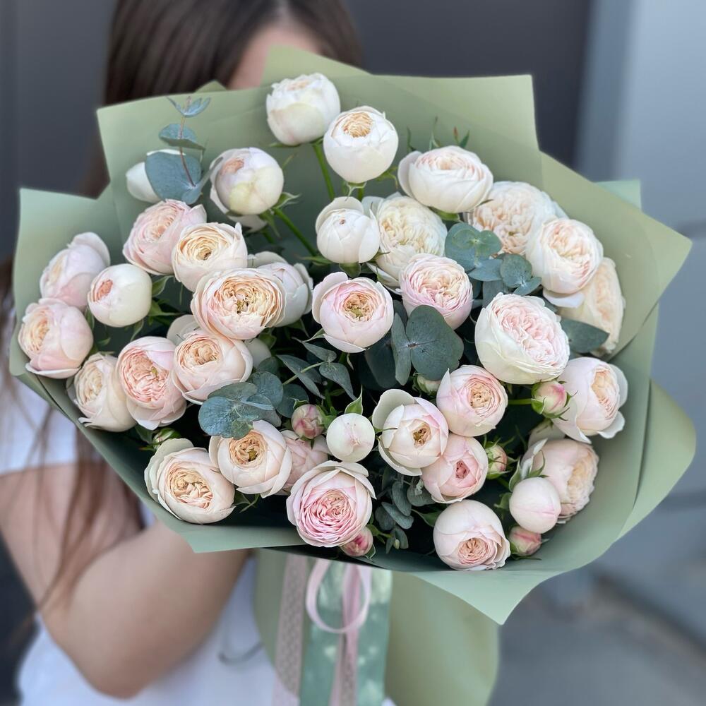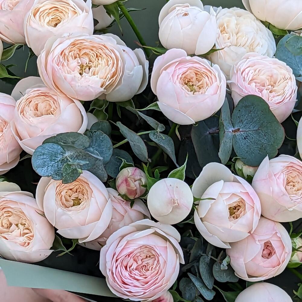 Кустовые пионовидные розы с эвкалиптом