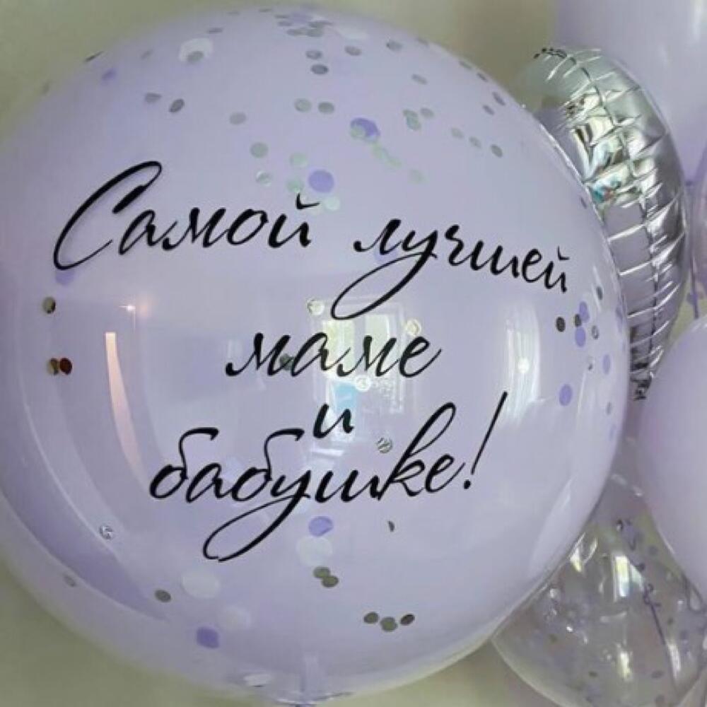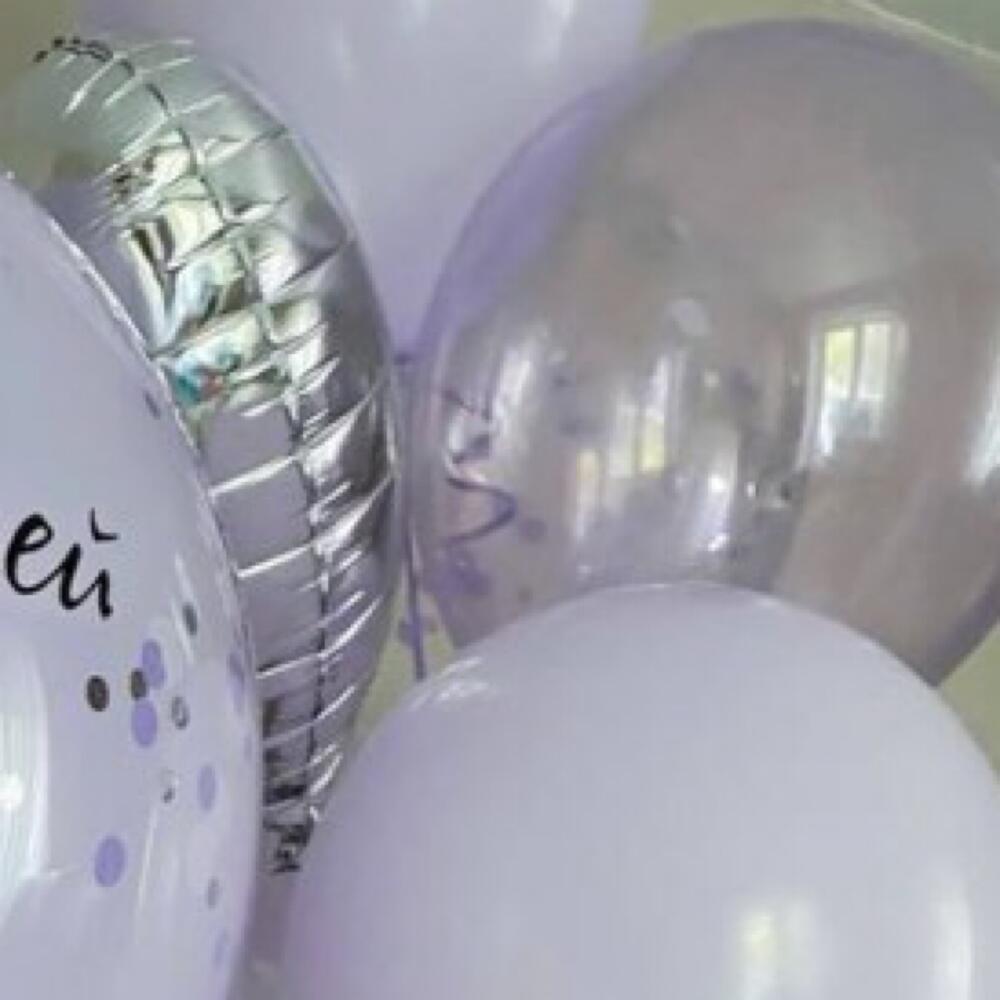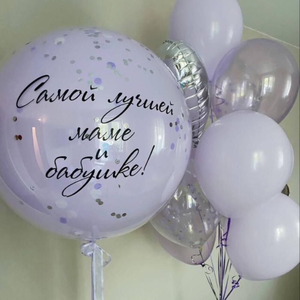 В наборе большой шар с Вашей надписью, а также фонтан из 10 шаров:- 1 сердце фольгированное- 2 шара с конфетти- 2 шара кристалл сиреневые- 5 шаров макарунс лавандовыеЦвет композиции может быть любым😉