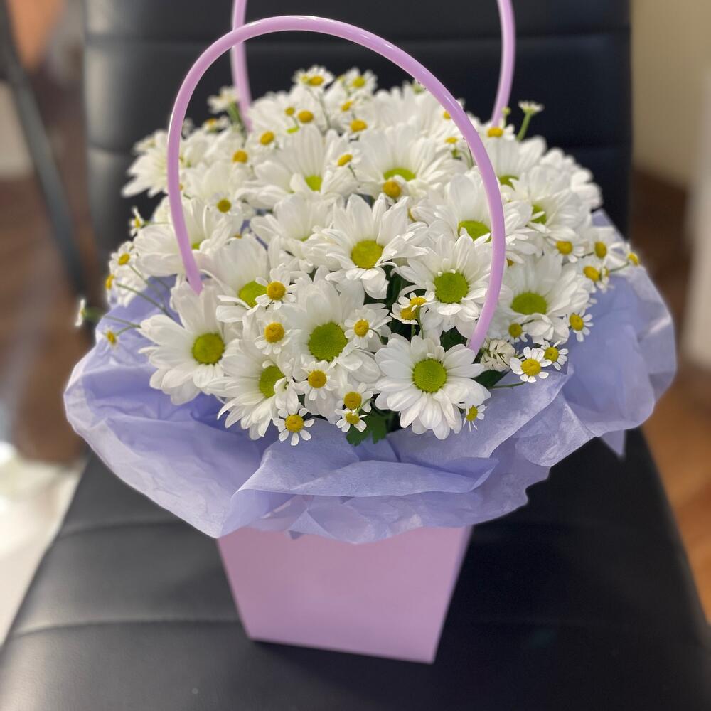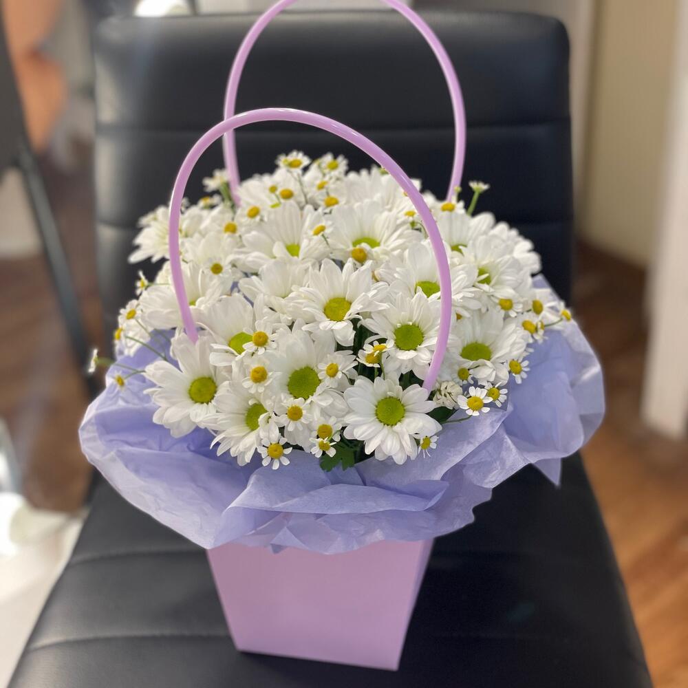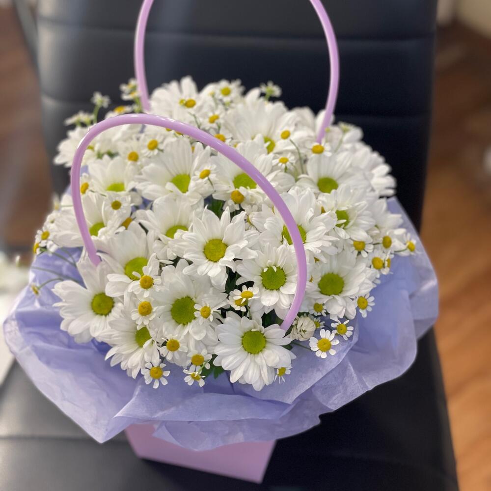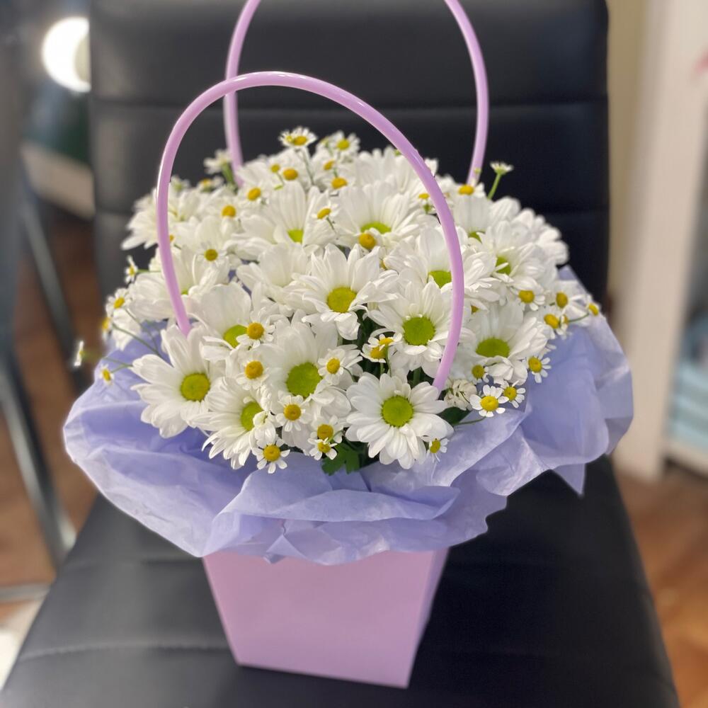 Хризантема кустовая - 3 шт. Оазис - 1 шт. Сумочка - 1 шт. Матрикария (Ромашка Камила) - 2 шт. Бумага тишью - 1 шт.