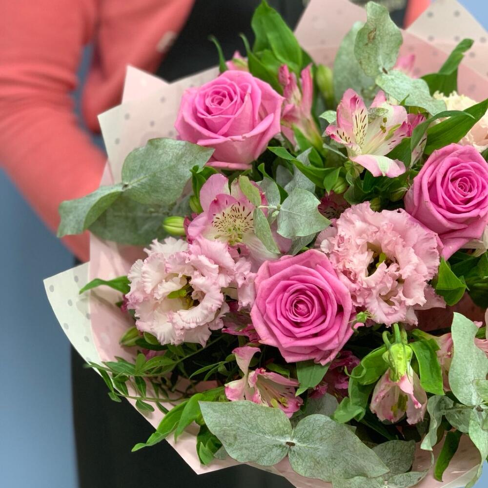 Упаковка – 1 шт. Лента атласная – 1 шт. Альстромерия розовая – 3 шт. Пистация – 2 шт. Роза Аква 50 см Россия – 3 шт. Эвкалипт цинерея – 1 шт. Лизиантус алиса пинк – 2 шт.