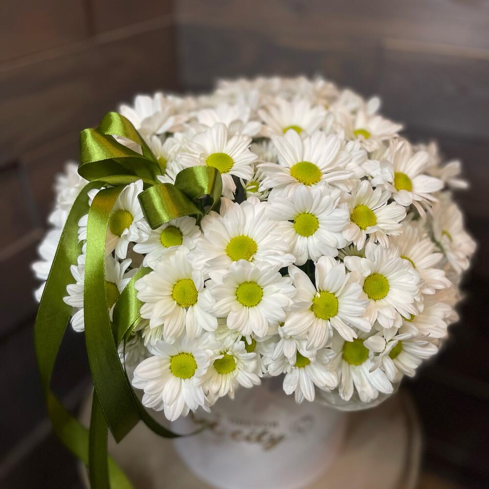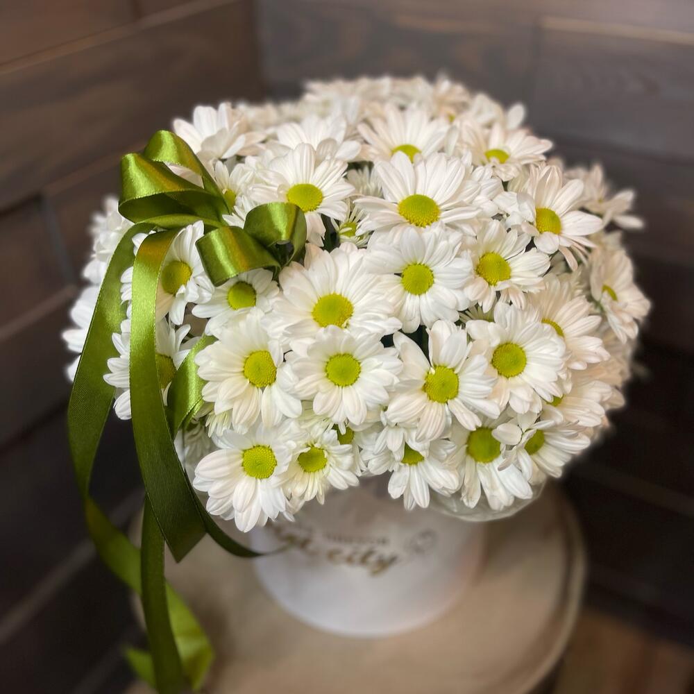 Хризантема кустовая - 6 шт. Лента атласная - 1 шт. Коробка шляпная - 1 шт. Оазис флористический - 1 шт.