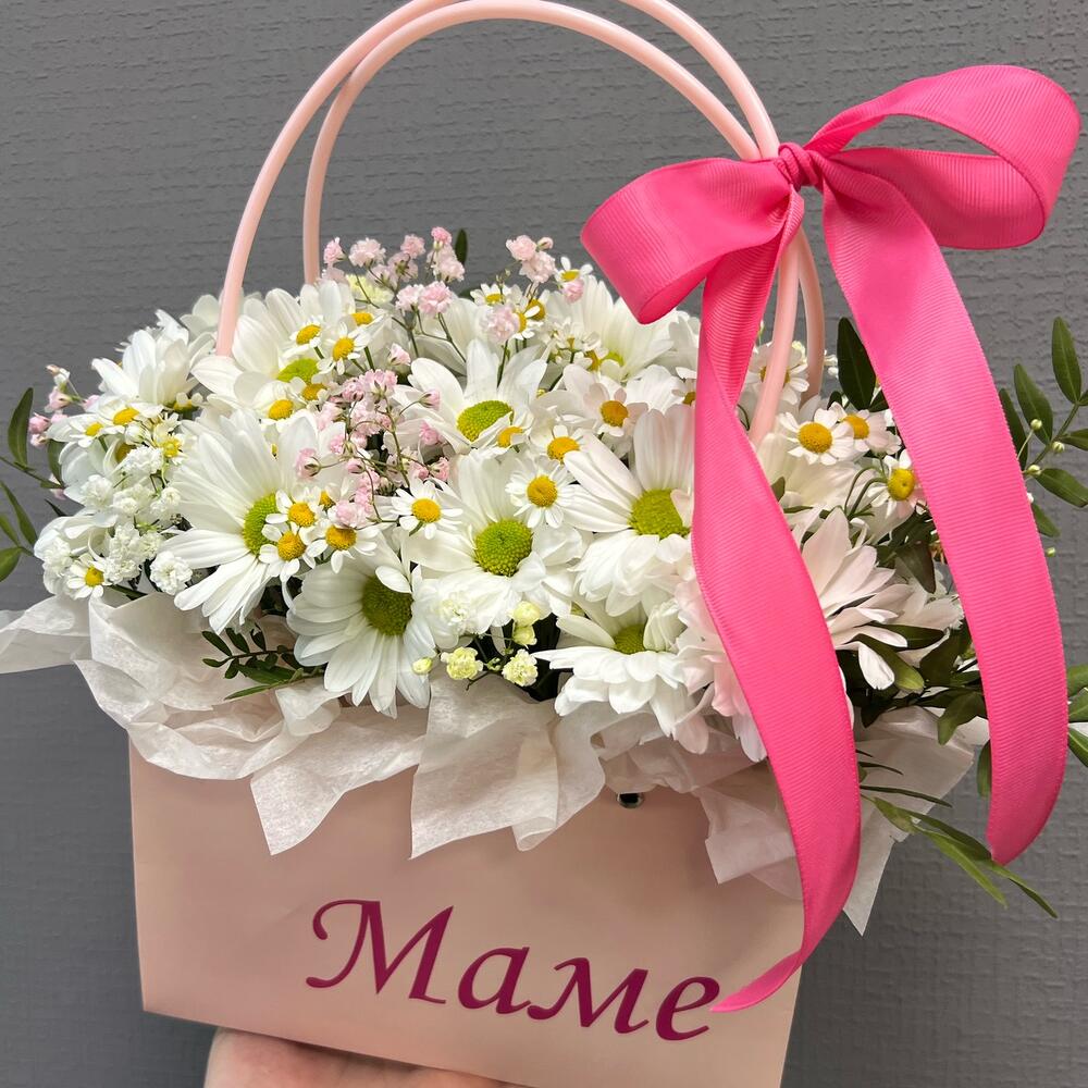 Гипсофила - 3 шт. Танацетум - 2 шт. Хризантема кустовая - 3 шт. Сумочка - 1 шт. Оазис флористический - 1 шт.