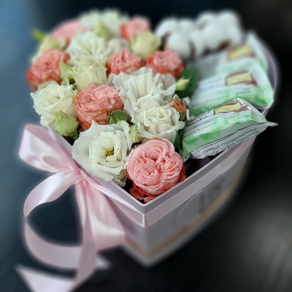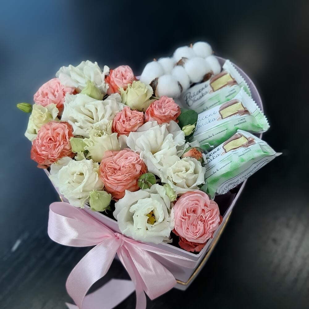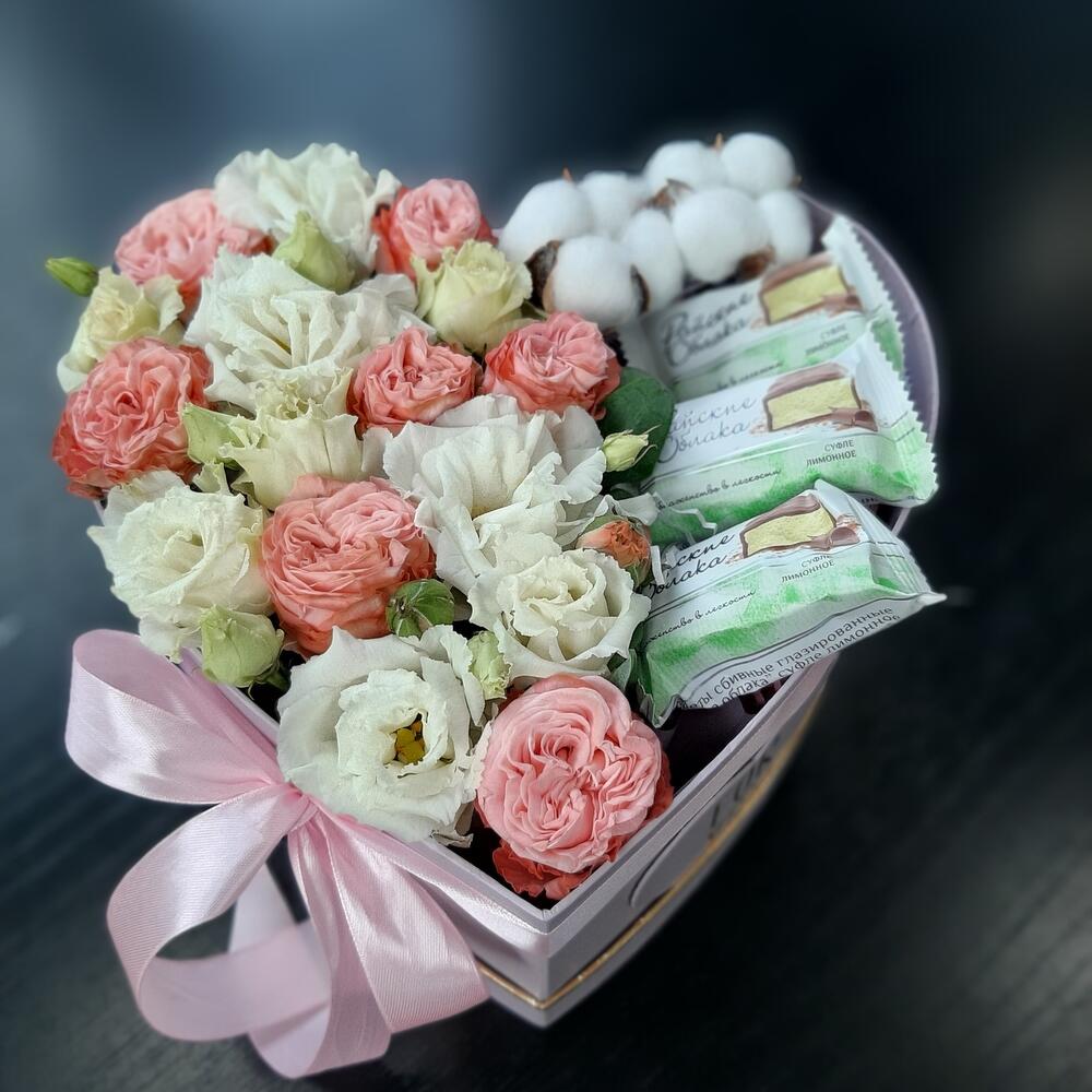 Лизиантус – 2 шт. Роза кустовая – 4 шт. Хлопок – 2 шт. Лента атласная – 1 шт. Коробка сердце – 1 шт. Конфеты шоколадные – 5 шт. Оазис флористический – 1 шт. Наполнитель стружка – 1 шт.