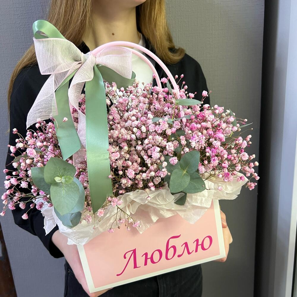 Гипсофила - 5 шт. Эвкалипт - 6 шт. Тишью - 2 шт. Сумочка - 1 шт. Оазис флористический - 1 шт. ленты атласные - 2 шт.