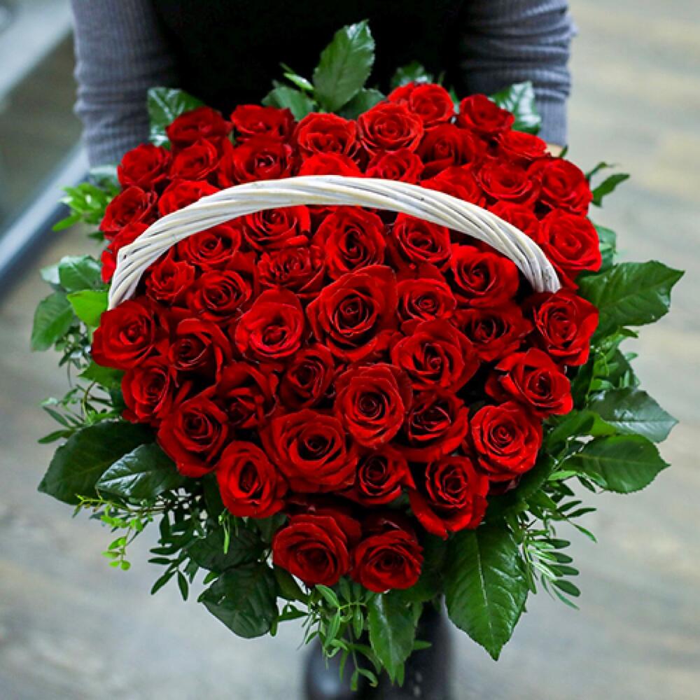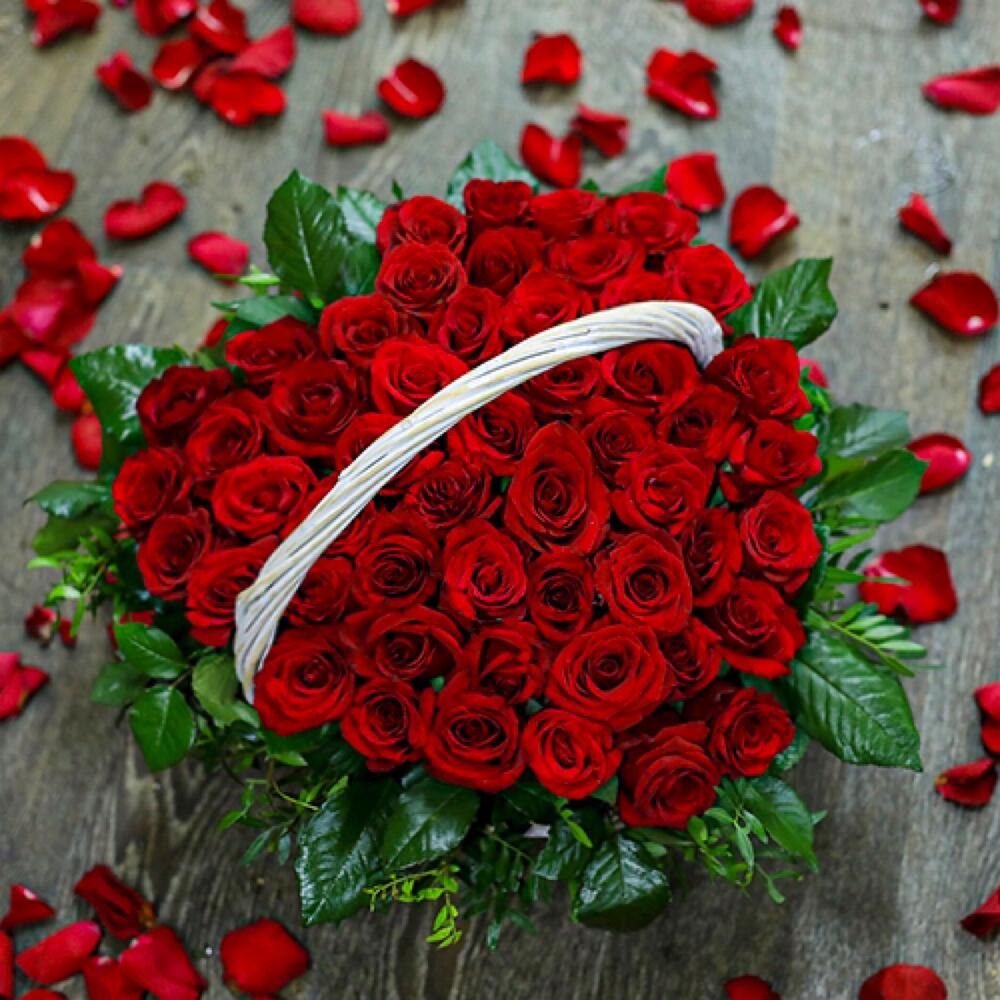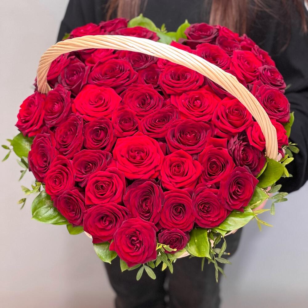 Роза красная - 51 шт. Салал - 5 шт. Фисташка - 5 шт. Корзина плетеная - 1 шт. Оазис флористический - 3 шт.