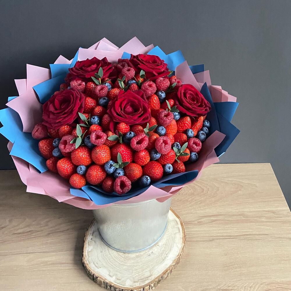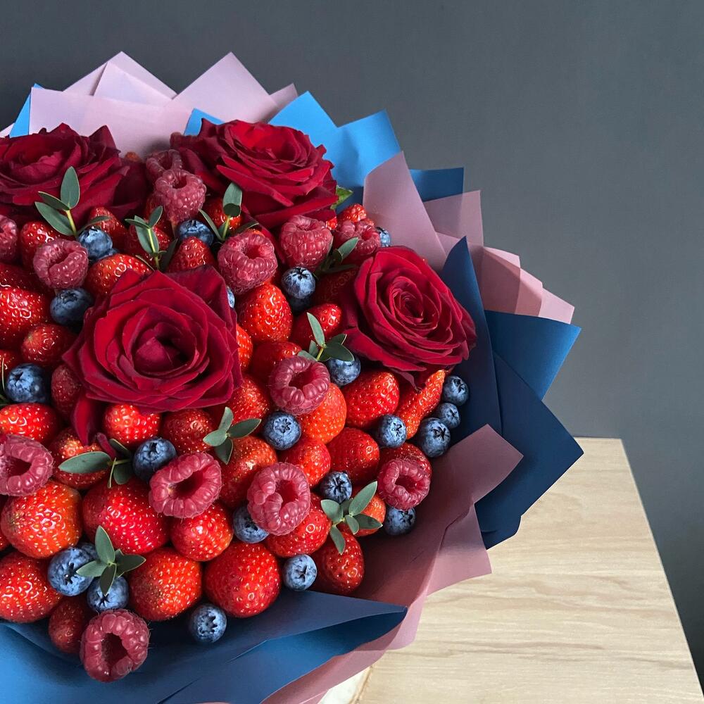 Букет с 1 кг клубники, малины и голубики в сочетании с красными розами идеальный букет , для того чтобы этот день запомнился на долгие годы!