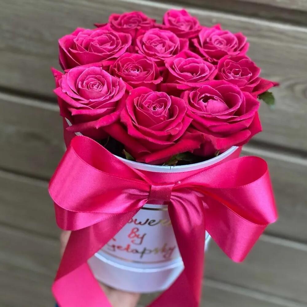 Шляпная коробка с лентами – 1 шт. Роза Шангрила – 11 шт. Оазис флористический – 1 шт.