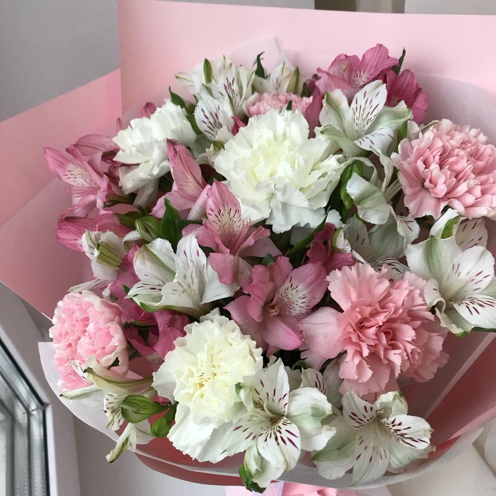 Альстромерия - 7 шт. Упаковка дизайнерская - 1 шт. Открыточка с вашими пожеланиями - 1 шт. диантусы - 6 шт.