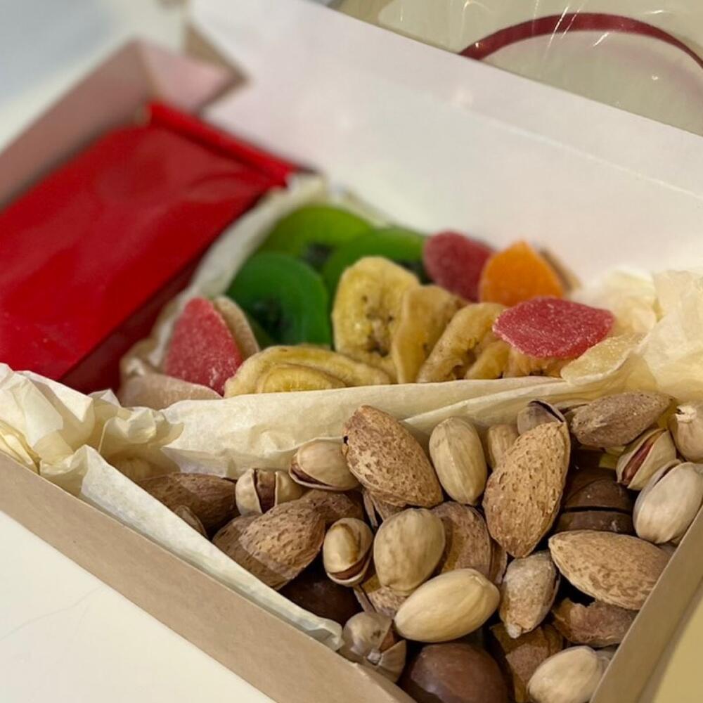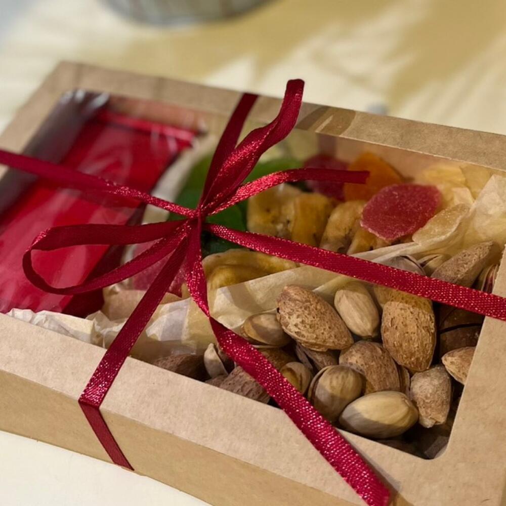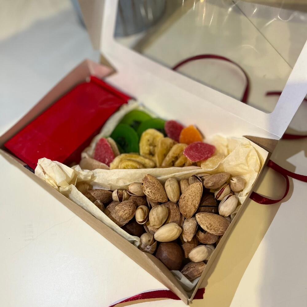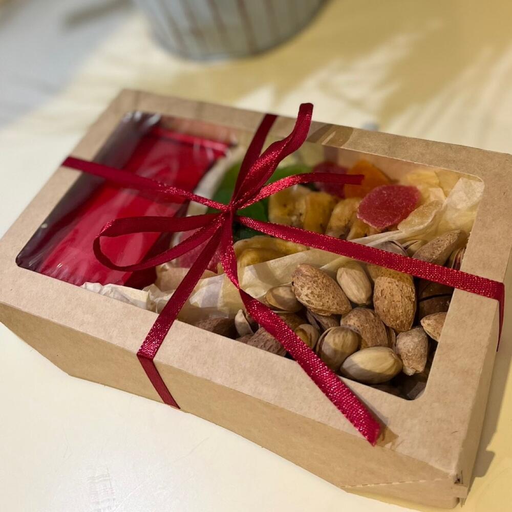 Киви – 1 шт. Фисташка – 1 шт. Коробка крафт – 1 шт. чай в ассортименте – 30 гр. макадамия) – 1 шт. микс орехов ( миндаль – 1 шт. микс сухофруктов ( банан – 1 шт. папайя ) – 1 шт.