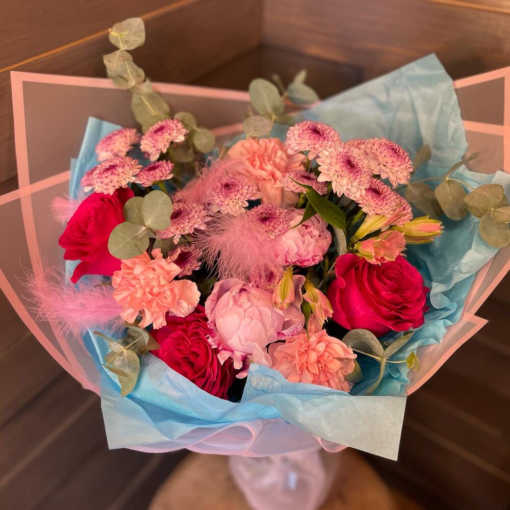 Альстромерия - 1 шт. Хризантема кустовая - 3 шт. Эвкалипт - 2 шт. Роза - 3 шт. Упаковка - 1 шт. Лента атласная - 1 шт. Диантус - 3 шт. перья - 2 шт. пионы - 2 шт.
