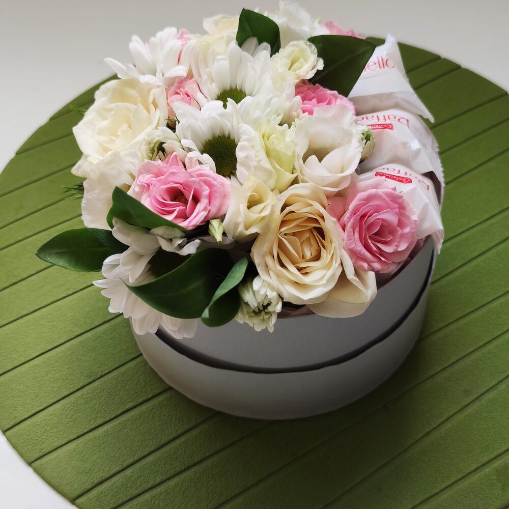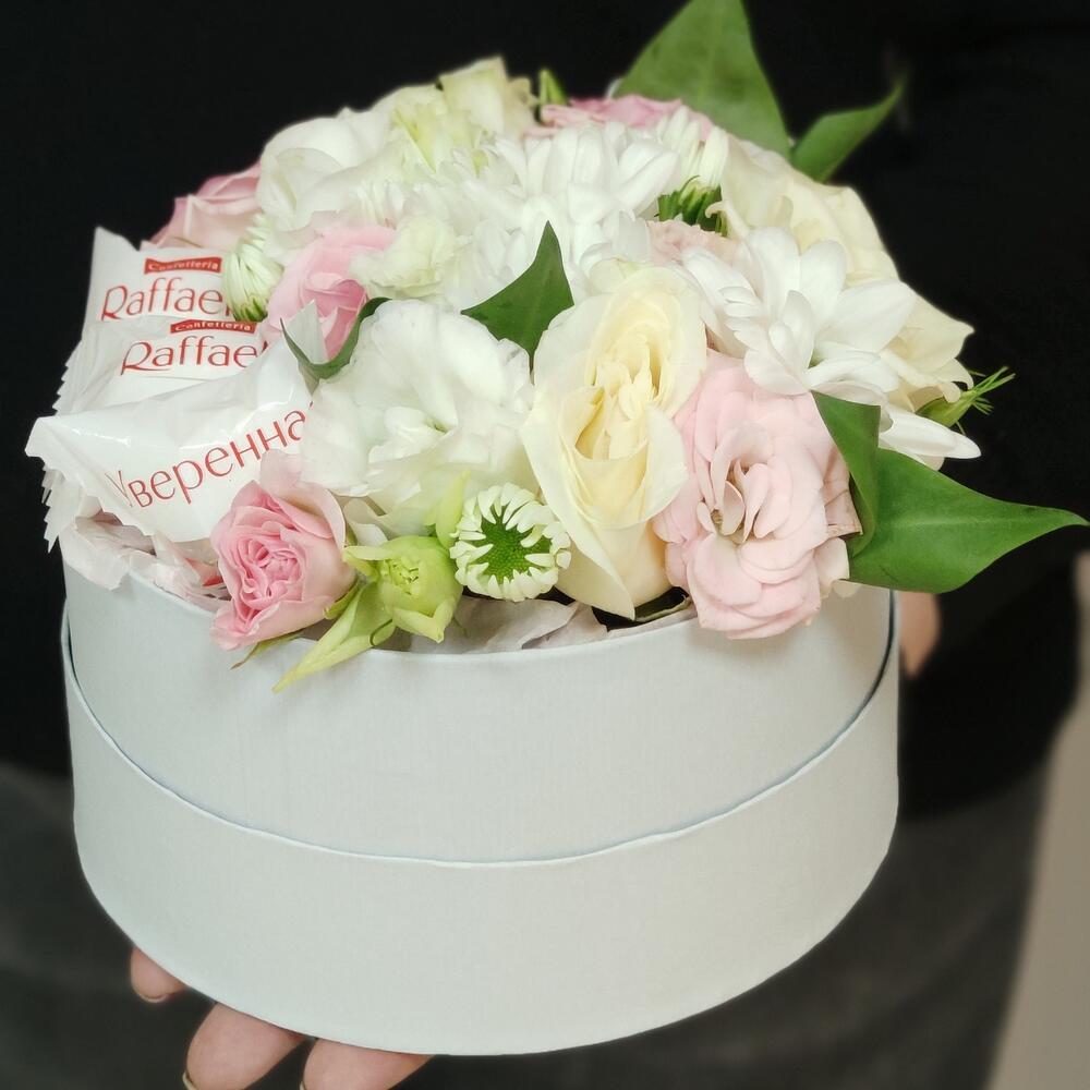 Коробка шляпная - 1 шт. Роза белая - 3 шт. Конфеты Raffaello - 3 шт. Роза кустовая розовая - 1 шт. Лизиантус белый - 1 шт. Хризантема Бакарди - 1 шт.