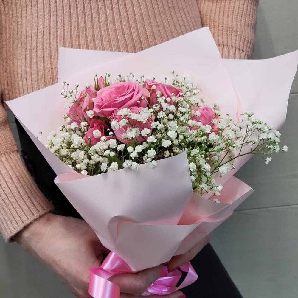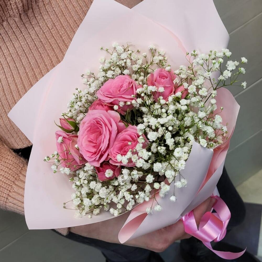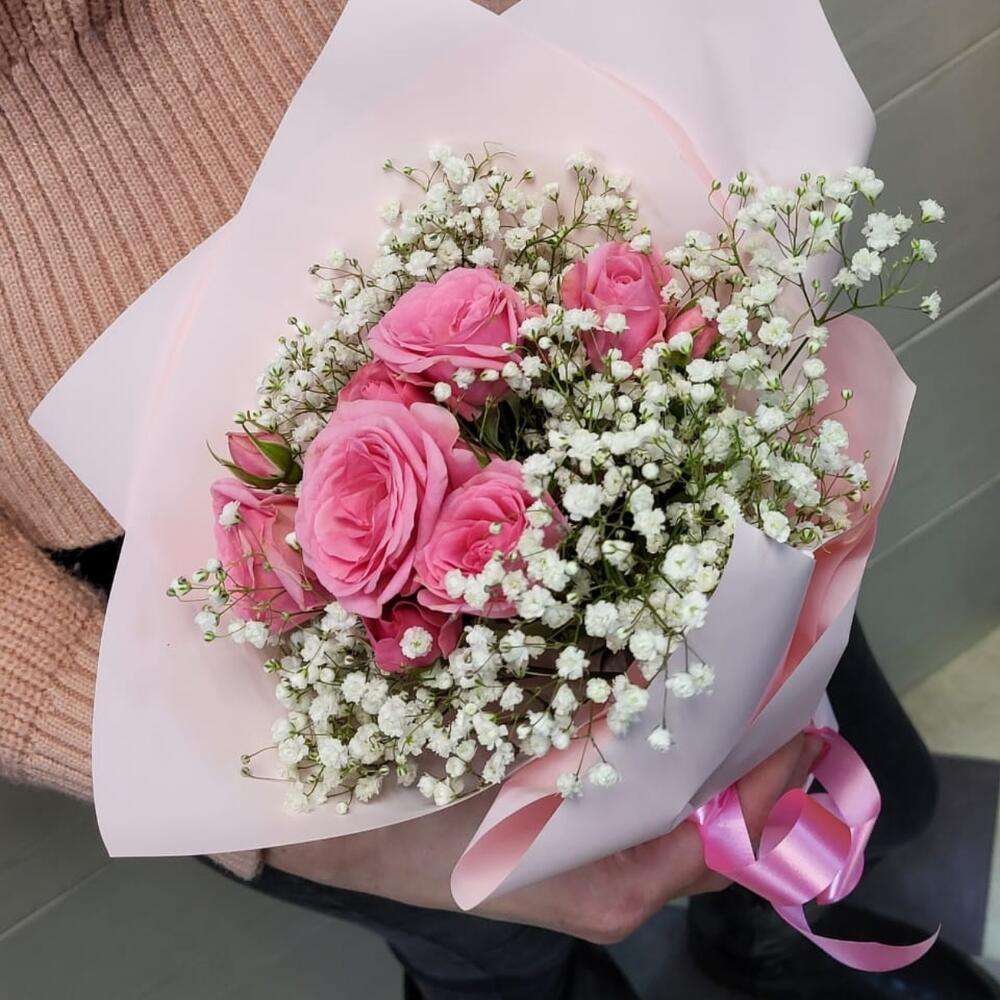 Гипсофила – 1 шт. Роза кустовая – 1 шт. Упаковка дизайнерская – 1 шт.