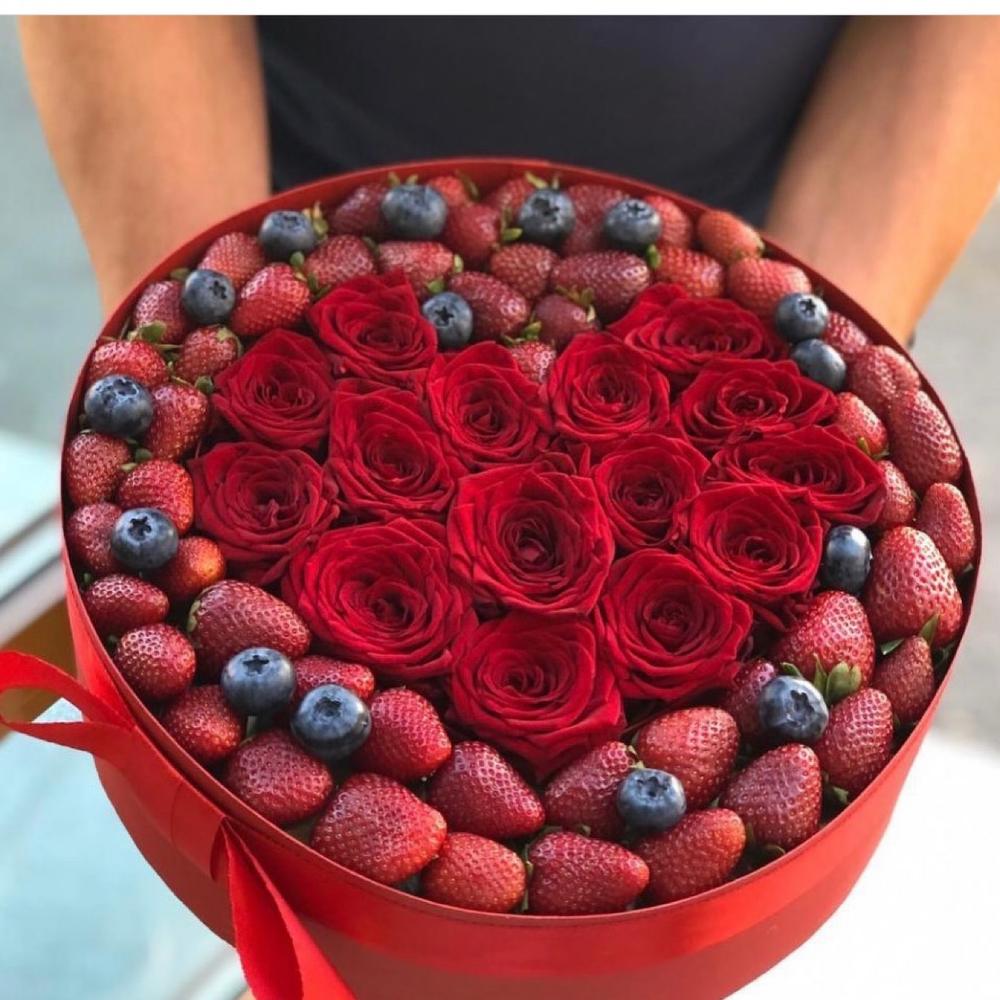Клубника - 300 гр. Роза Эквадор - 15 шт. Шляпная коробка - 1 шт. Голубика - 50 гр.