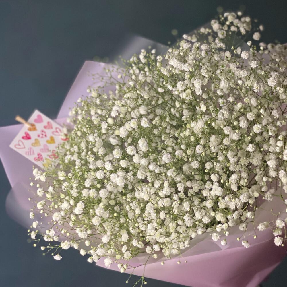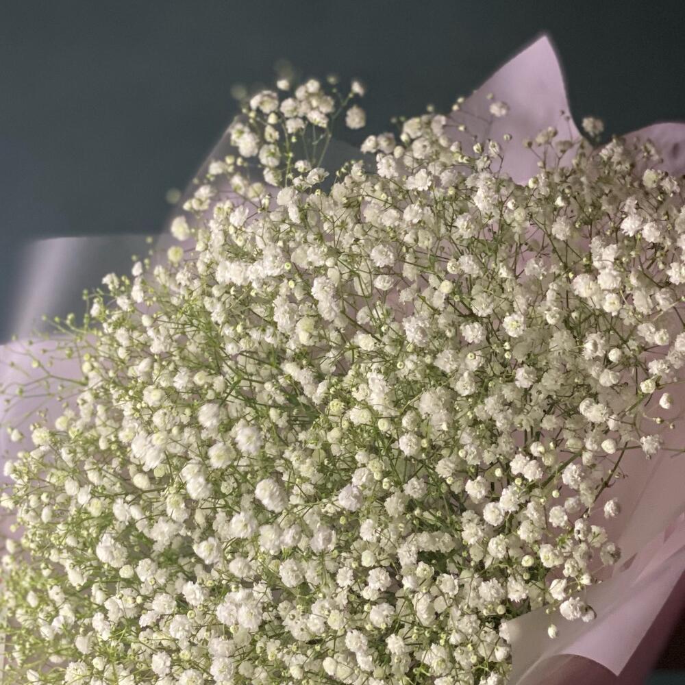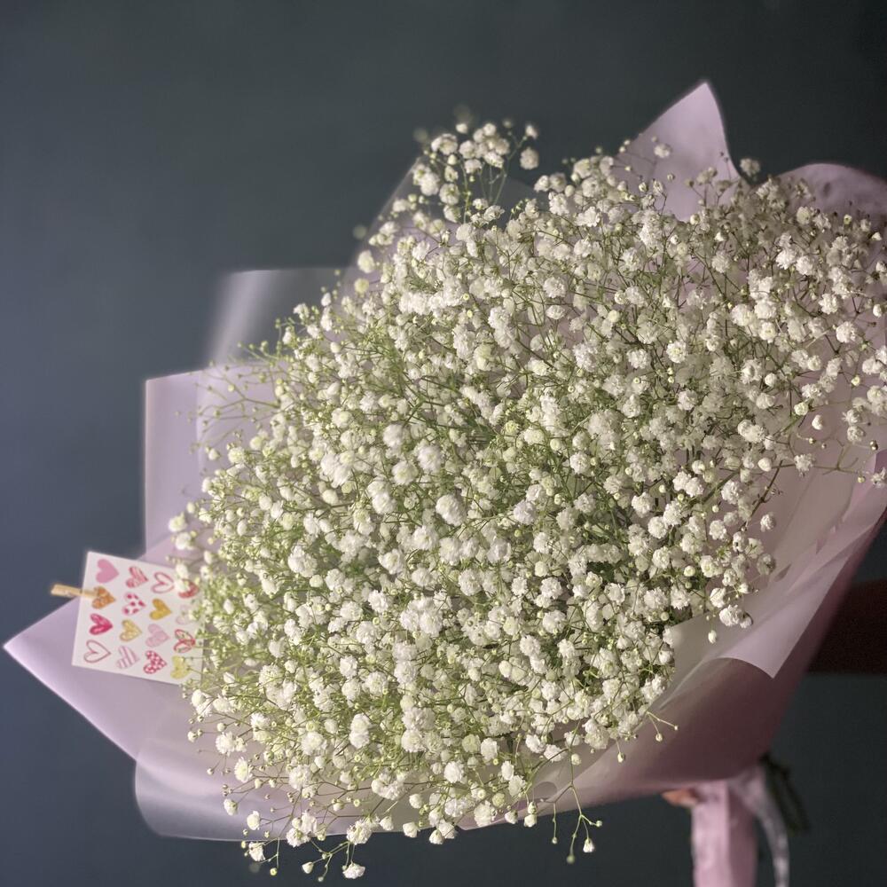 Гипсофила – 7 шт. Лента атласная – 1 шт. Современная упаковка – 1 шт.