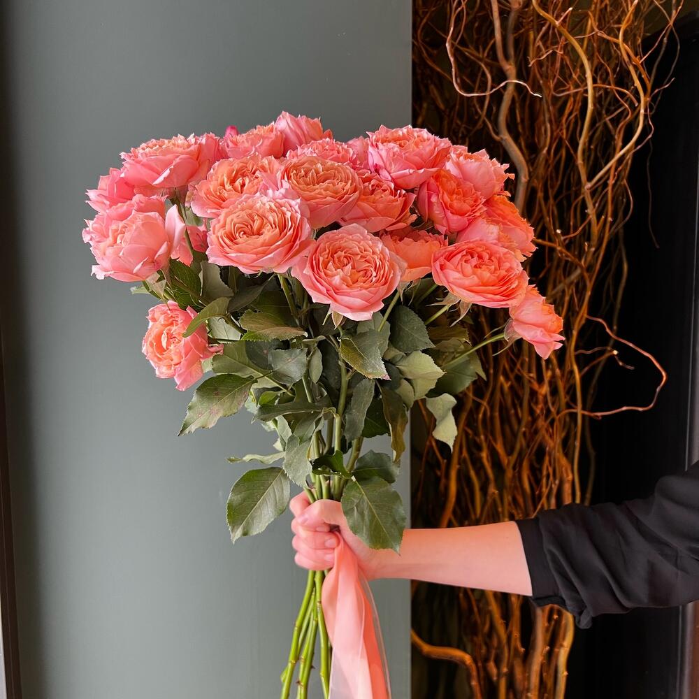 Лента атласная – 1 шт. Роза кустовая пионовидная – 9 шт.