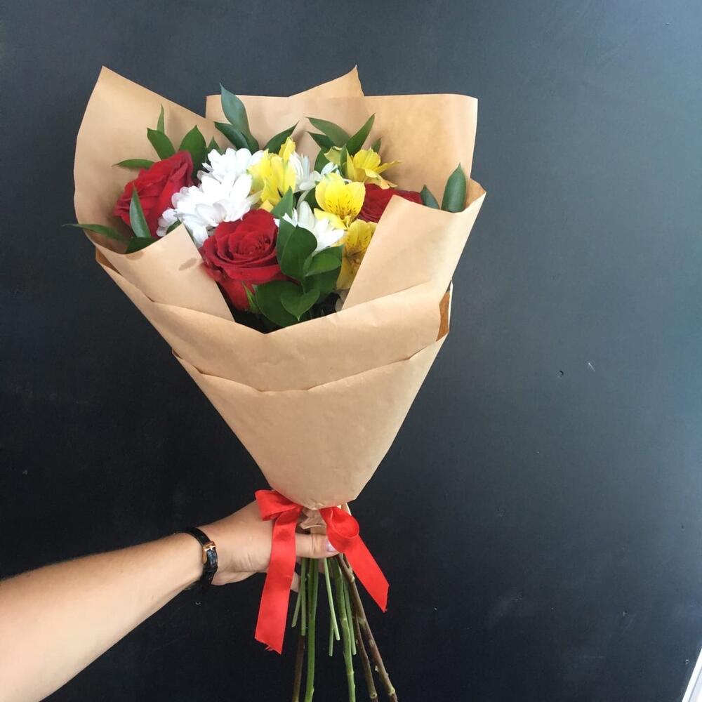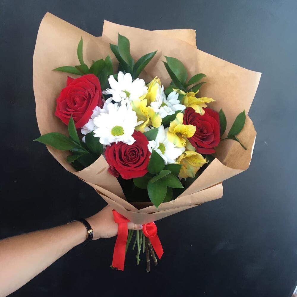 Альстромерия – 1 шт. Рускус – 5 шт. Хризантема кустовая – 1 шт. Роза одноголовая – 3 шт.