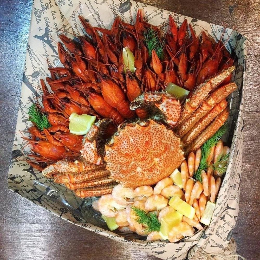 Зелень - 1 шт. Лимон - 1 шт. Раки - 1000 гр. креветки - 500 гр. краб волосатик - 1 шт.