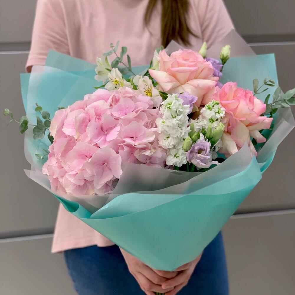 Альстромерия - 1 шт. Эвкалипт - 2 шт. Роза Софи Лорен - 2 шт. Оформление - 1 шт. Маттиола белая - 2 шт. Гортензия Верена пинк Пале - 1 шт. эустома белая - 1 шт.