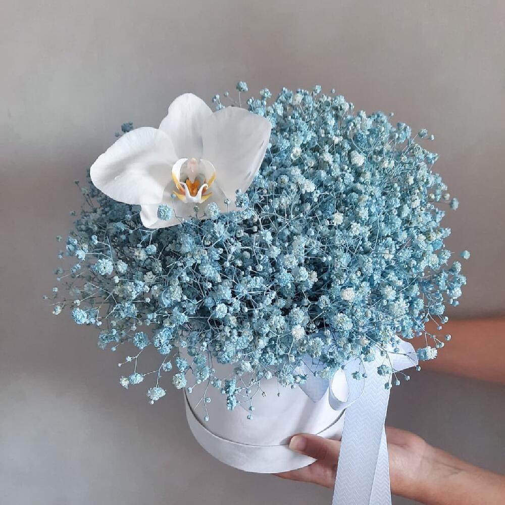 Гипсофила – 6 шт. Коробка шляпная – 1 шт. ЦИМБИДИУМ – 1 шт. Оазис флористический – 1 шт.