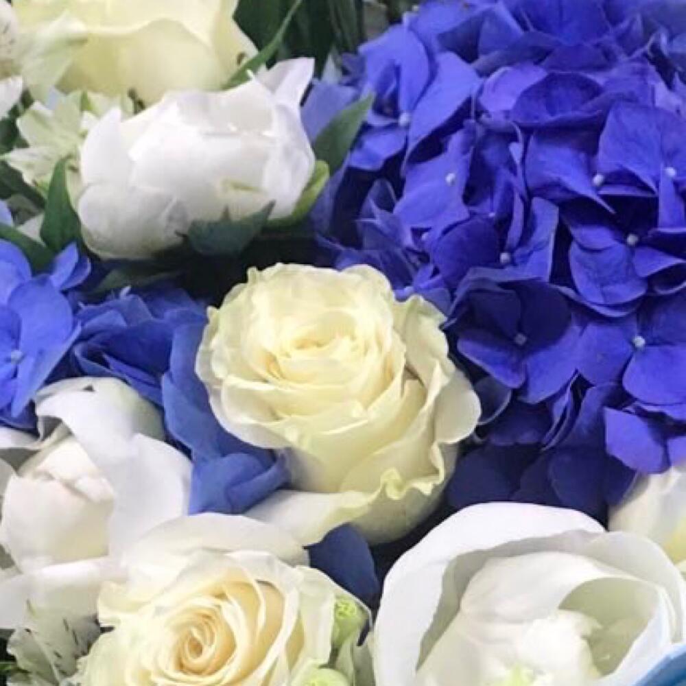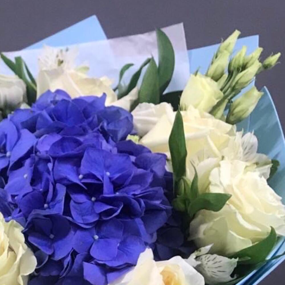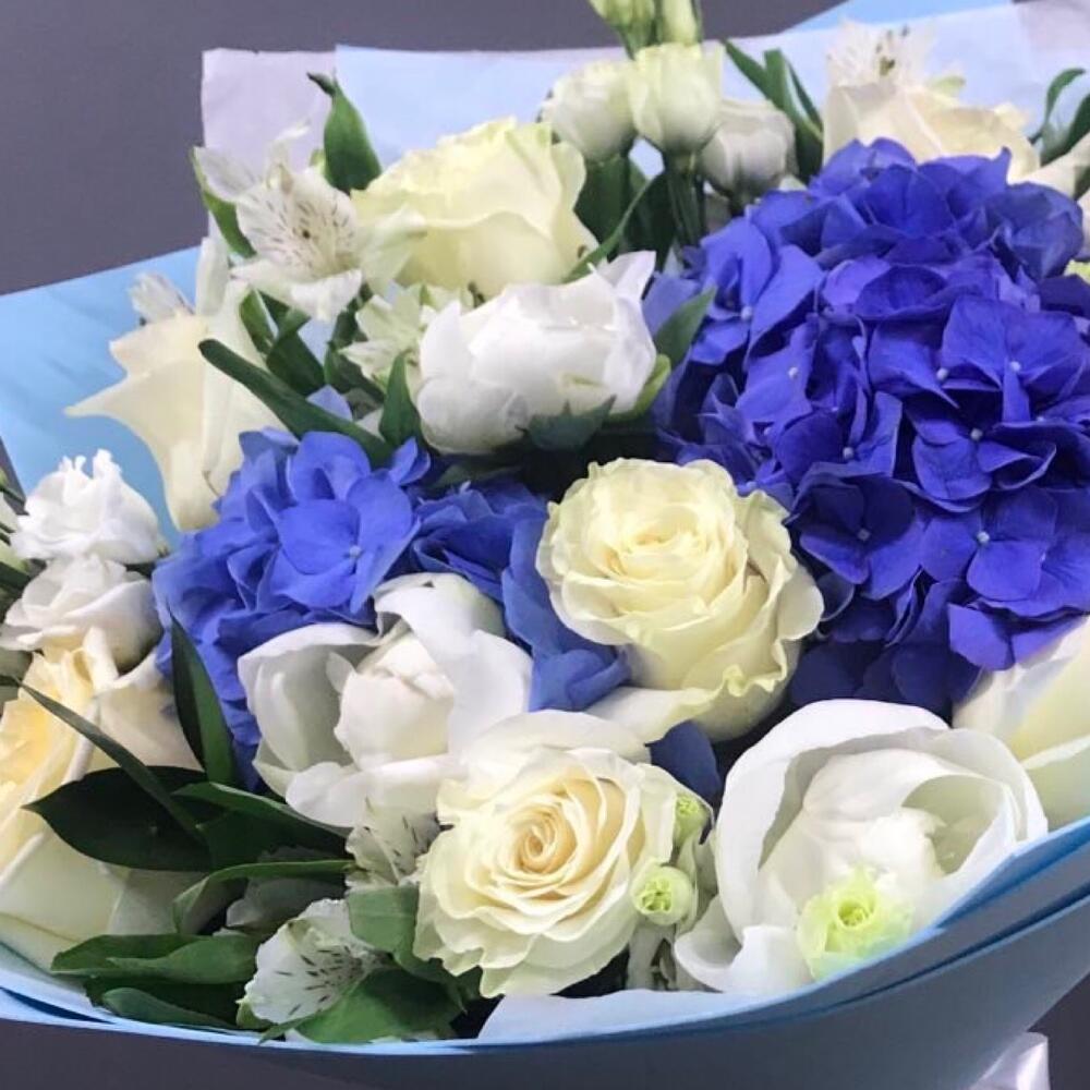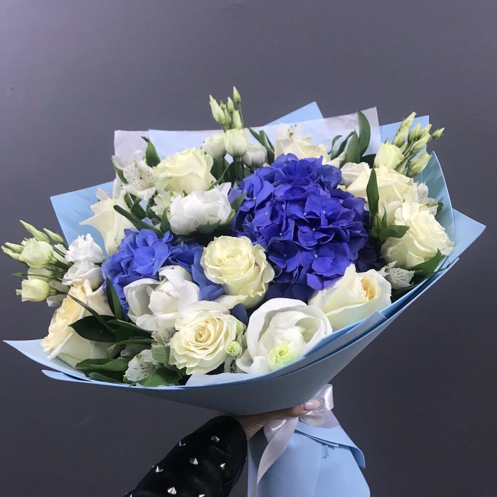 Красивый букет с гортензией в бело-синей контрастной гамме. Возможна замена сезонных цветов.