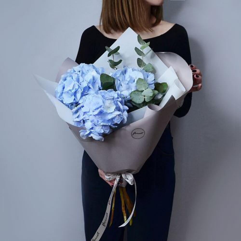 Эвкалипт – 2 шт. Атласная лента – 1 шт. Гортензия голубая – 3 шт. Матовая пленка – 3 шт.