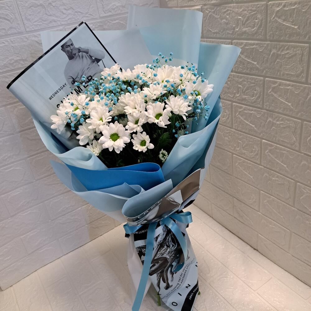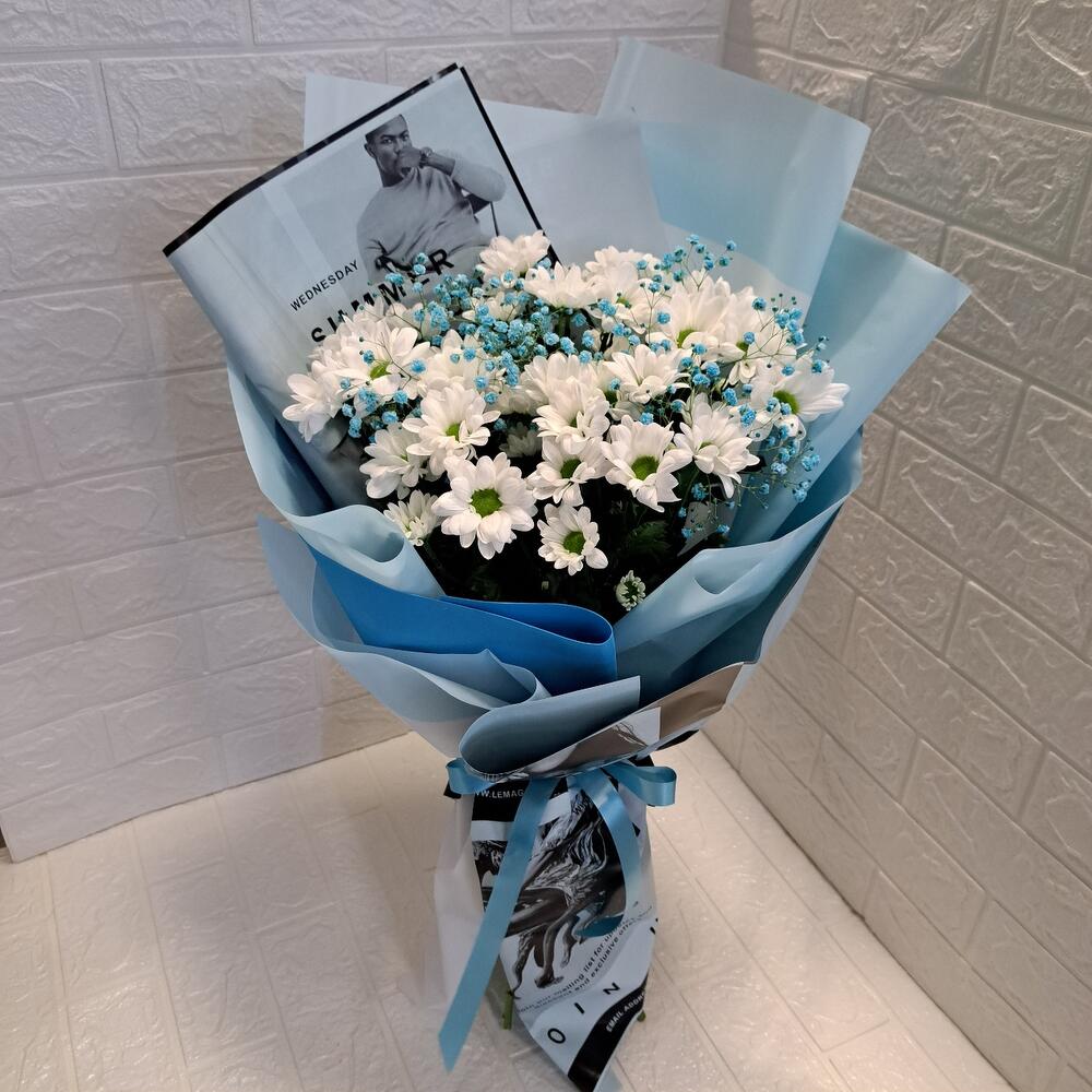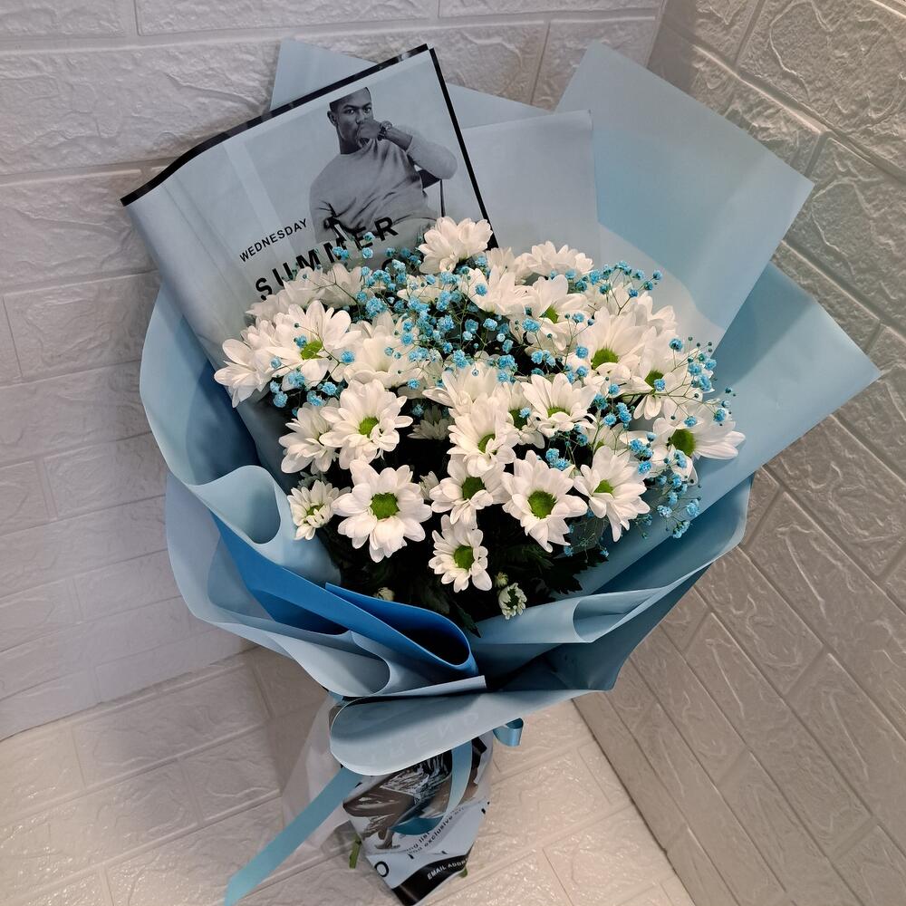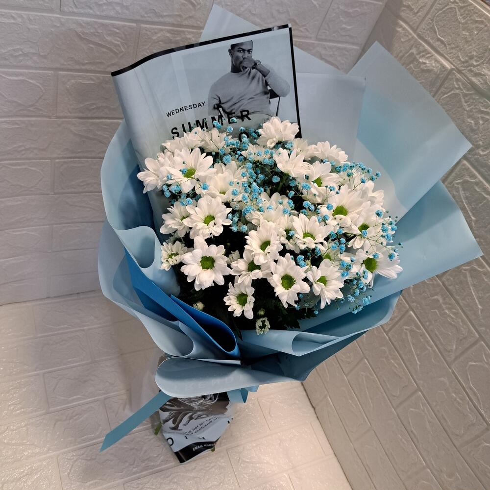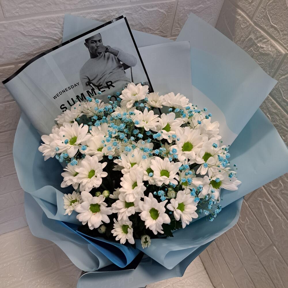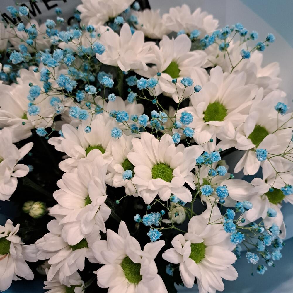 Лента – 1 шт. Хризантема кустовая – 5 шт. Упаковка дизайнерская – 8 шт. гипсофила радужная – 2 шт.
