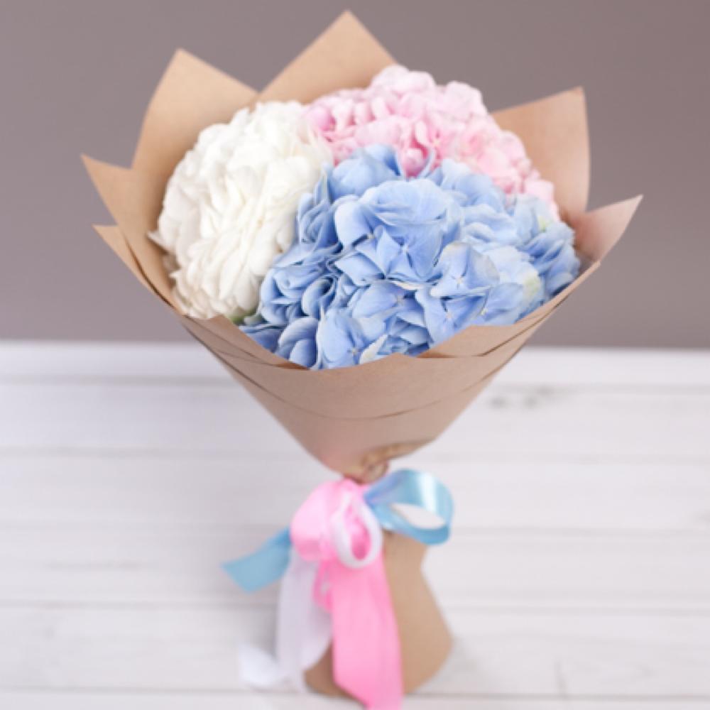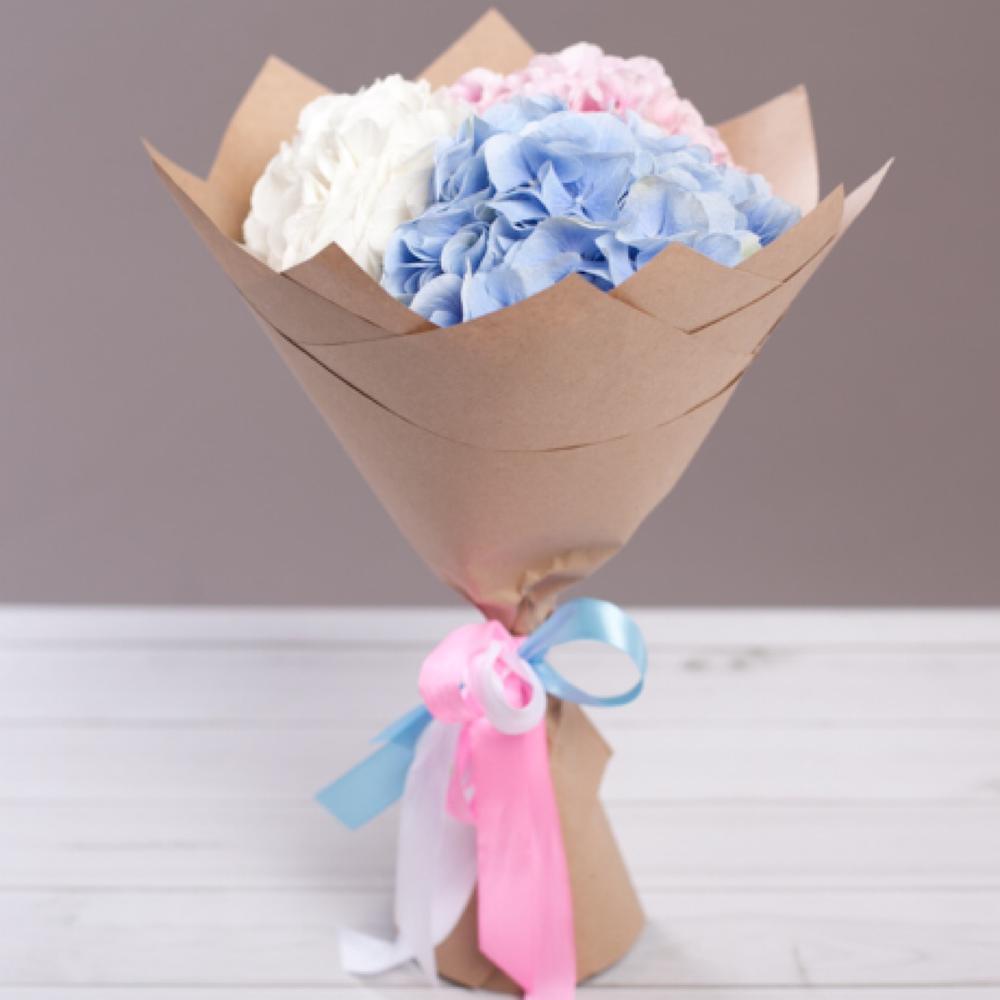 Лента атласная – 3 шт. Гортензия белая – 1 шт. Гортензия голубая – 1 шт. Крафт упаковка – 4 шт. Гортензия розовая – 1 шт.