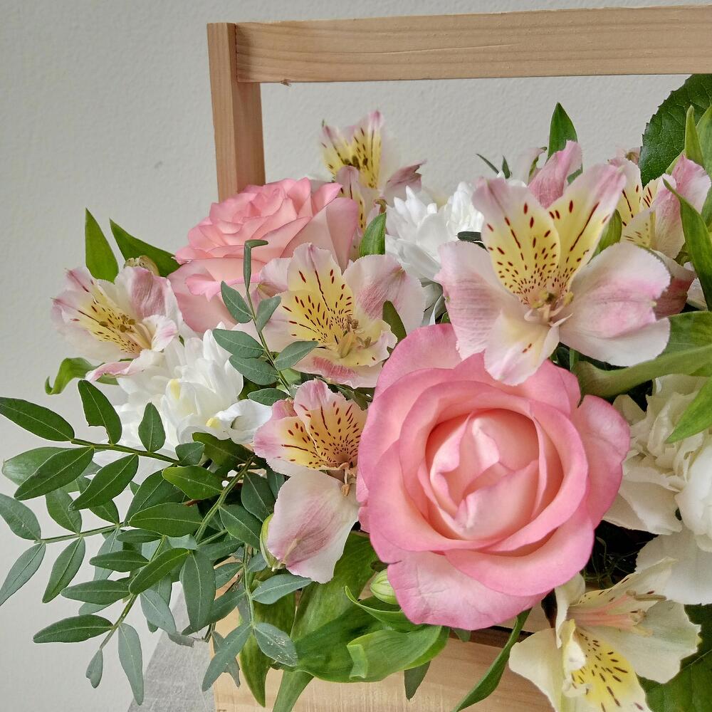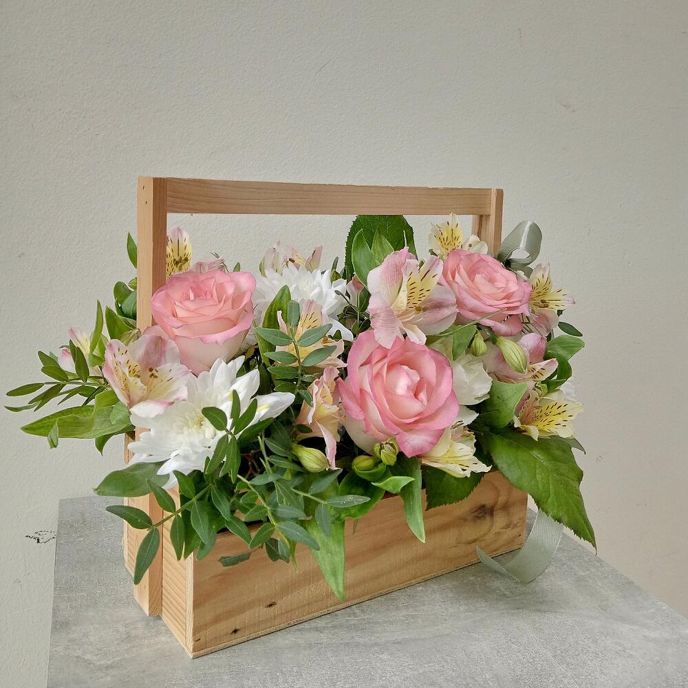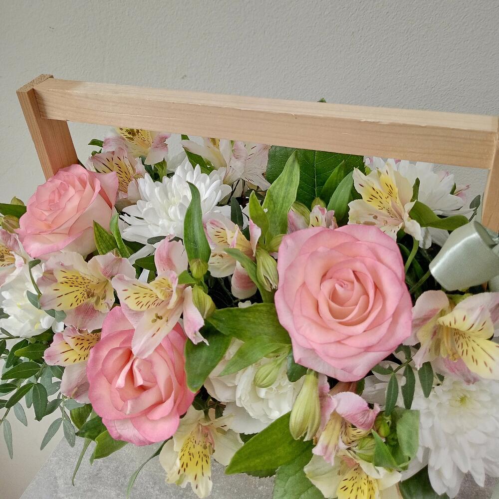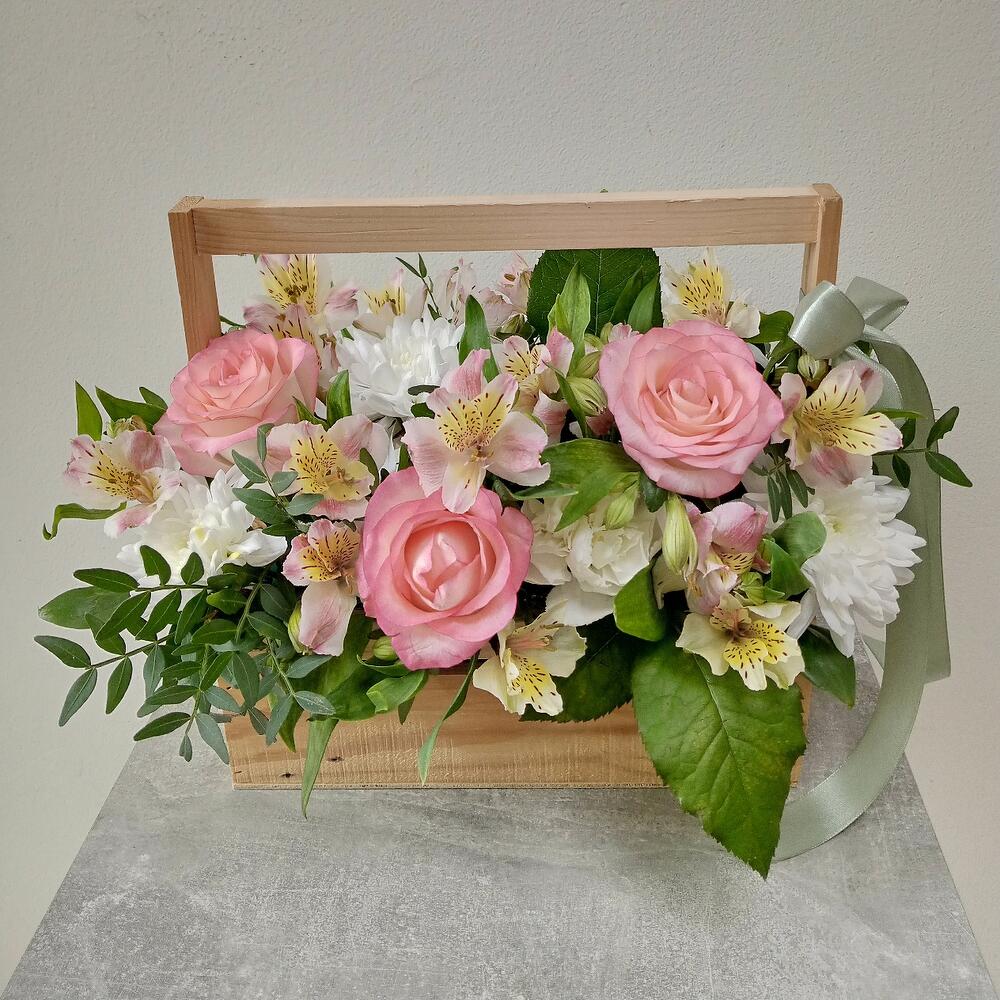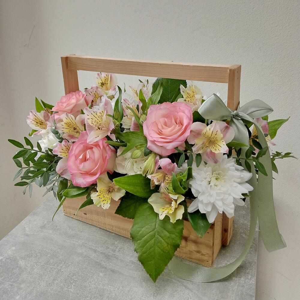 Альстромерия - 5 шт. Рускус - 4 шт. Хризантема кустовая - 1 шт. Роза - 3 шт. Диантус - 1 шт. Фисташка - 1 шт. Ящик деревянный - 1 шт. Оазис флористический - 1 шт.