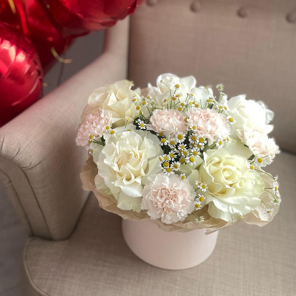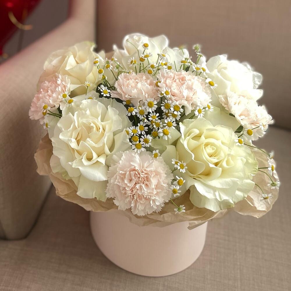 Диантус – 5 шт. Шляпная коробка – 1 шт. Роза Софи Лорен – 5 шт. Оазис флористический – 1 шт. танацетум кустовой – 3 шт.