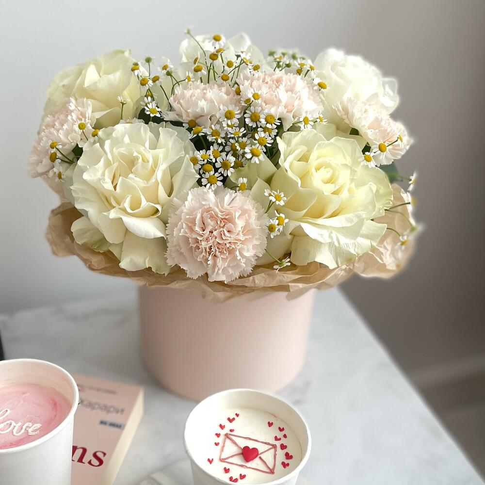 Диантус - 5 шт. Шляпная коробка - 1 шт. Роза Софи Лорен - 5 шт. Оазис флористический - 1 шт. танацетум кустовой - 3 шт.