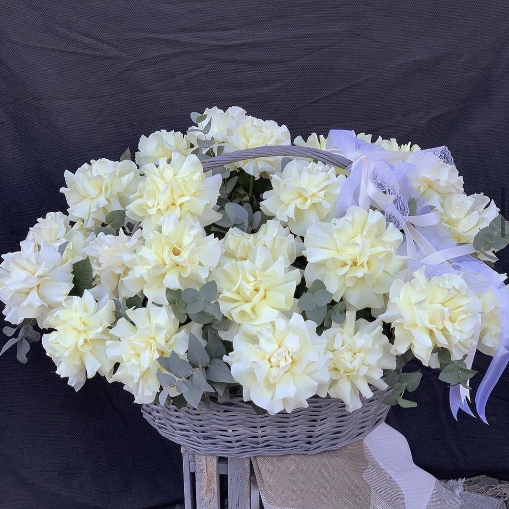 Корзина – 1 шт. Эвкалипт – 10 шт. Роза Софи Лорен – 33 шт.