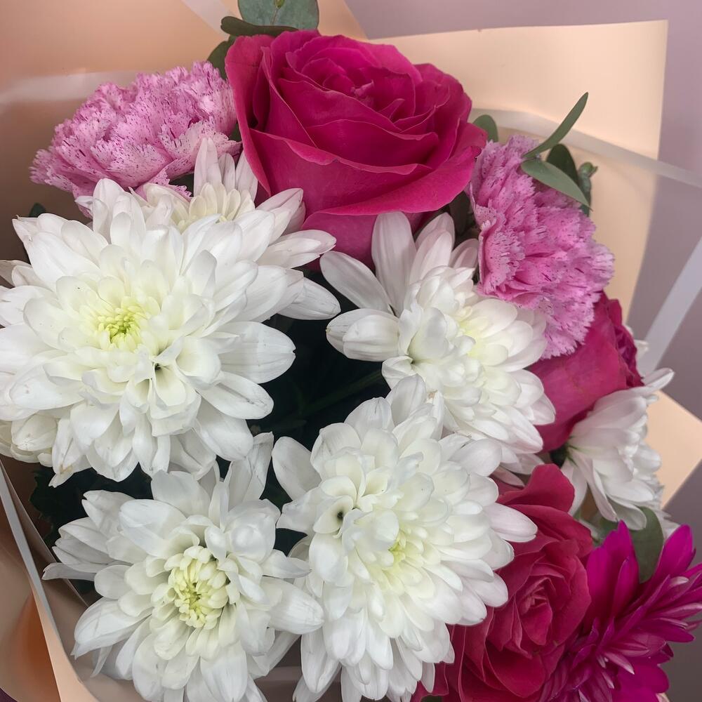 Хризантема кустовая - 2 шт. Эвкалипт - 1 шт. Роза Эквадор - 3 шт. Упаковка - 3 шт. Гвоздика - 3 шт. Гербера - 1 шт.