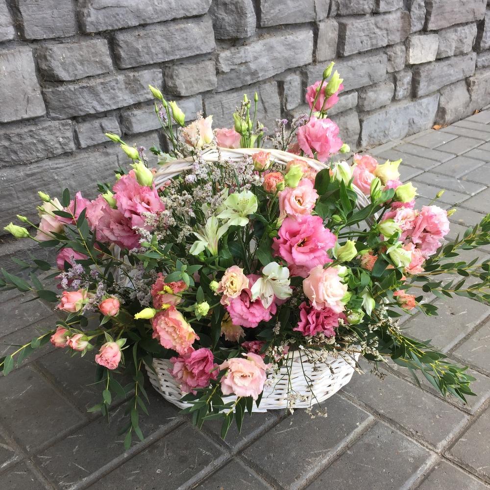 Альстромерия – 5 шт. Лизиантус – 15 шт. Роза кустовая – 5 шт. Эвкалипт – 7 шт. Корзина плетеная – 1 шт.
