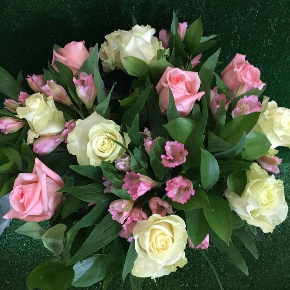 Альстромерия - 5 шт. Рускус - 7 шт. Роза розовая - 4 шт. Роза белая - 7 шт.