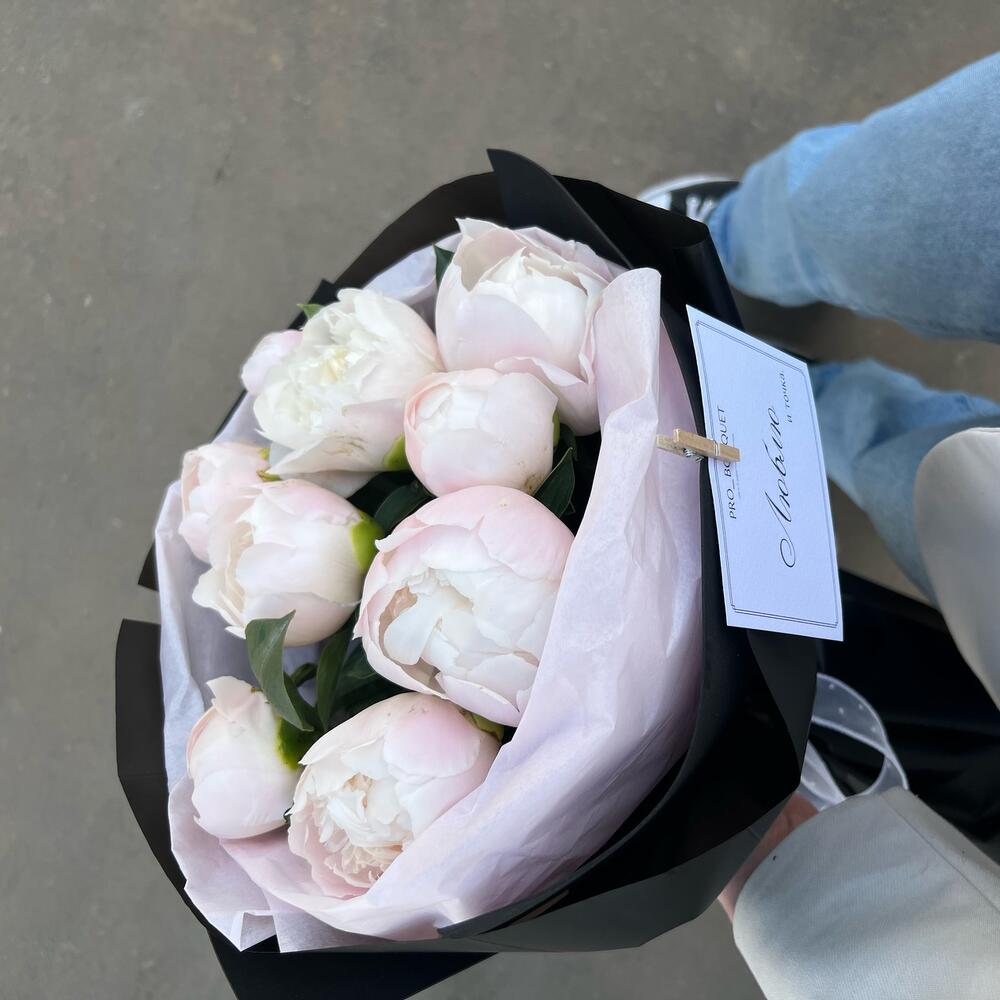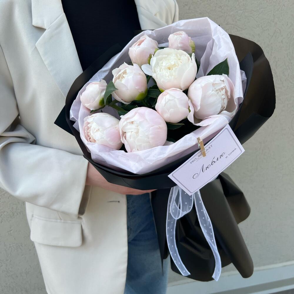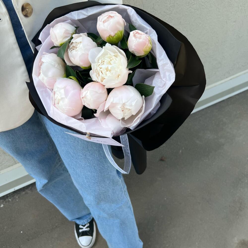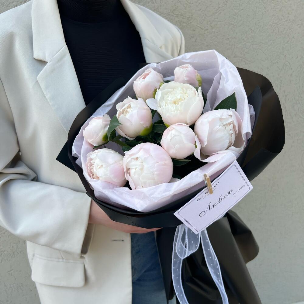 Пион - 9 шт. Лента атласная - 1 шт. Упаковка дизайнерская - 1 шт.