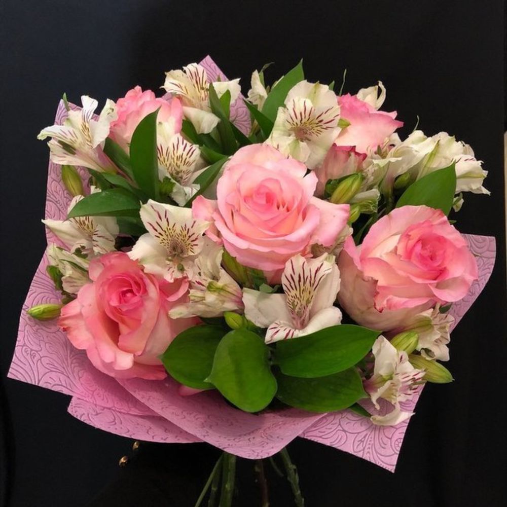 Нежный букет в бело-розовых тонах с розами и альстромериями