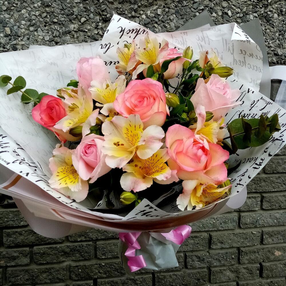 Альстромерия - 4 шт. Лента - 1 шт. Эвкалипт - 2 шт. Роза - 7 шт. Фисташка - 3 шт. Крафт - 1 шт. Пленка матовая - 1 шт.