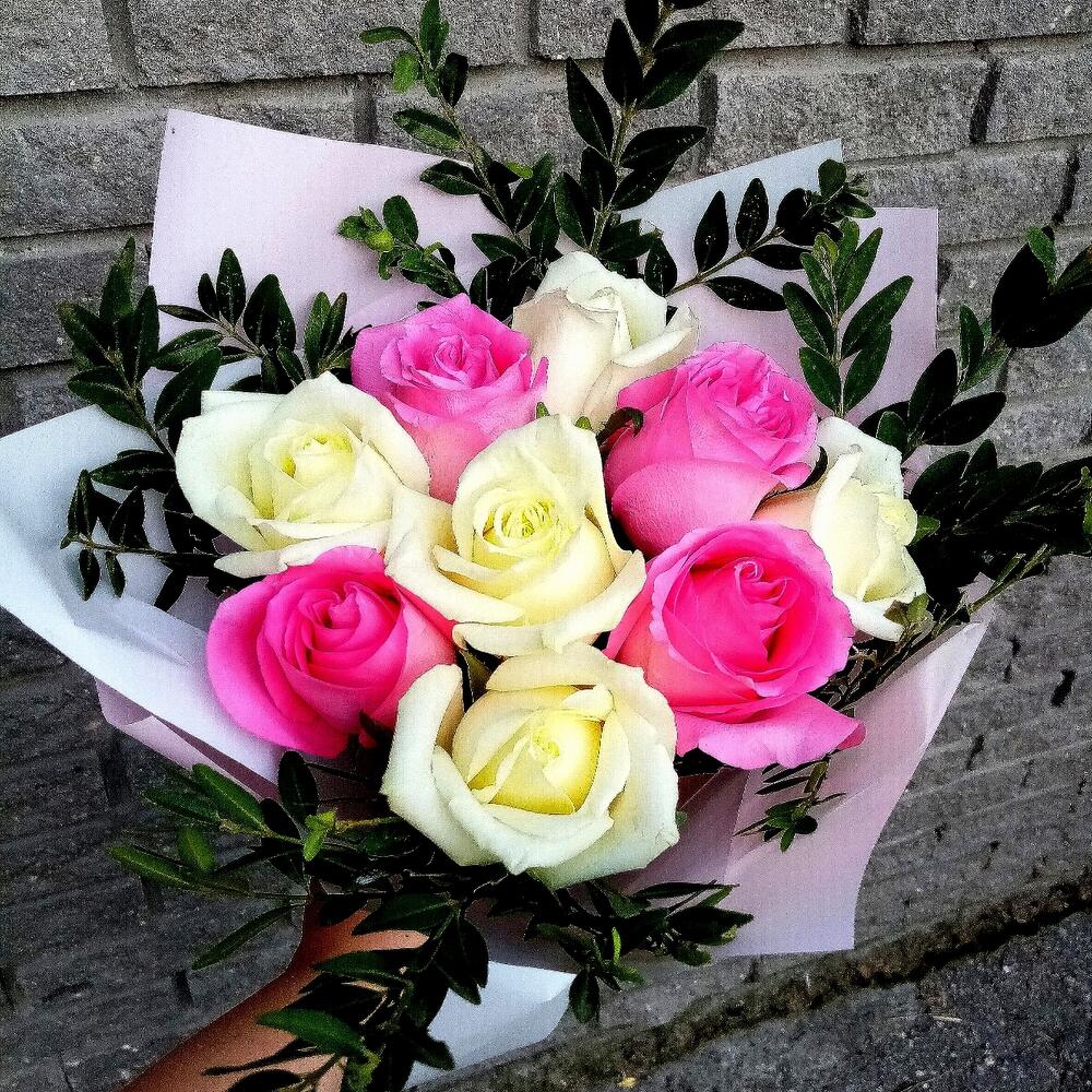 Лента - 1 шт. Роза - 9 шт. Фисташка - 4 шт. Пленка матовая - 2 шт.